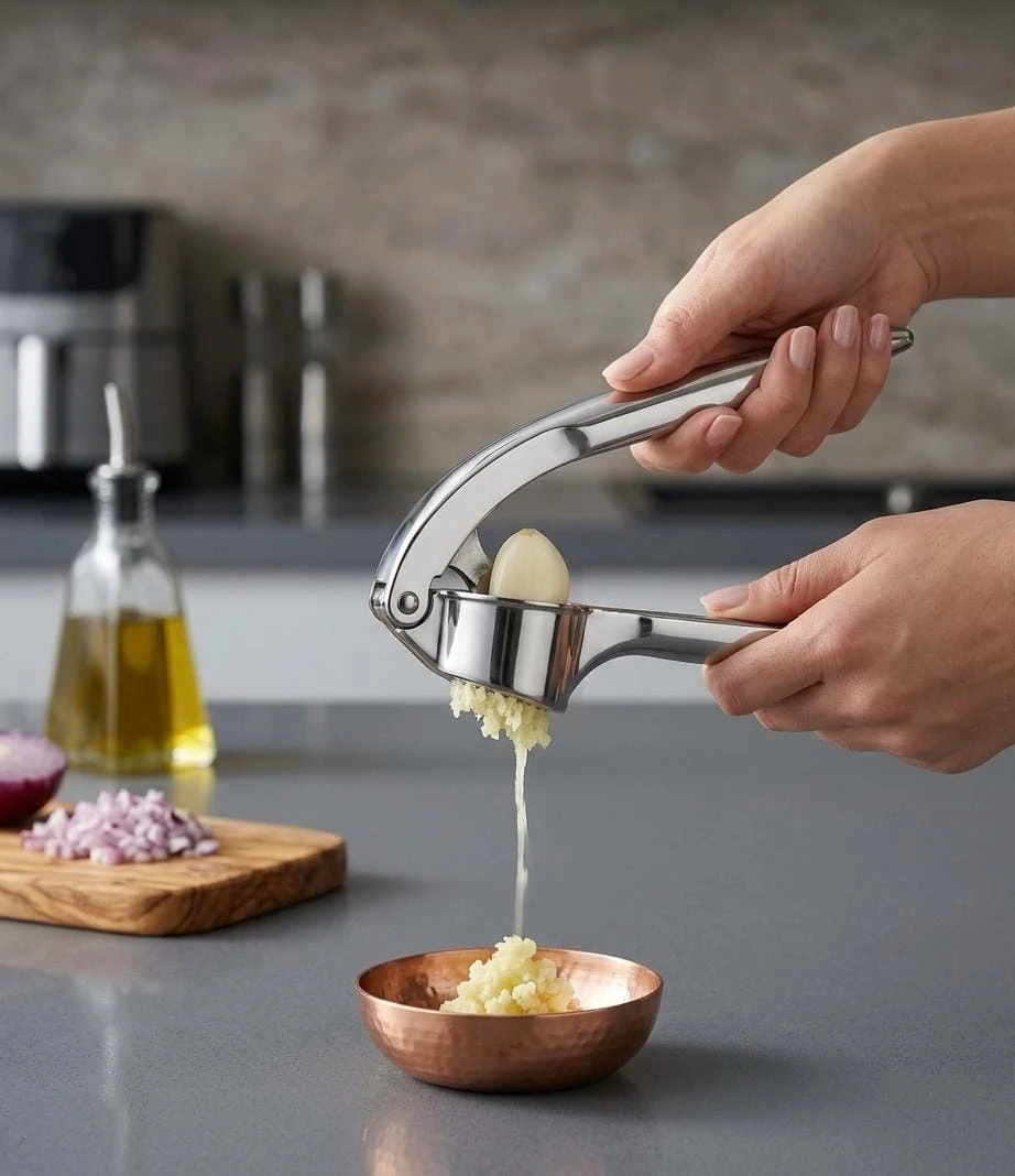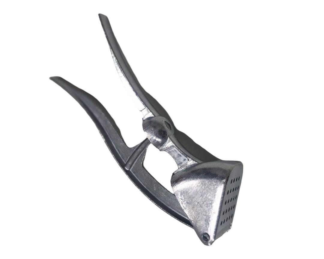 عجانة ثوم (أو معصور ثوم) مصنوعة من المعدن، مصممة لاستخلاص عصير الثوم بسهولة. يأتي المنتج مع غلاف بلاستيكي أحمر مع كتابة "Kitchen Tools" على الغلاف، وهو مناسب للاستخدام في المطبخ لتحضير الثوم بسرعة وكفاءة.