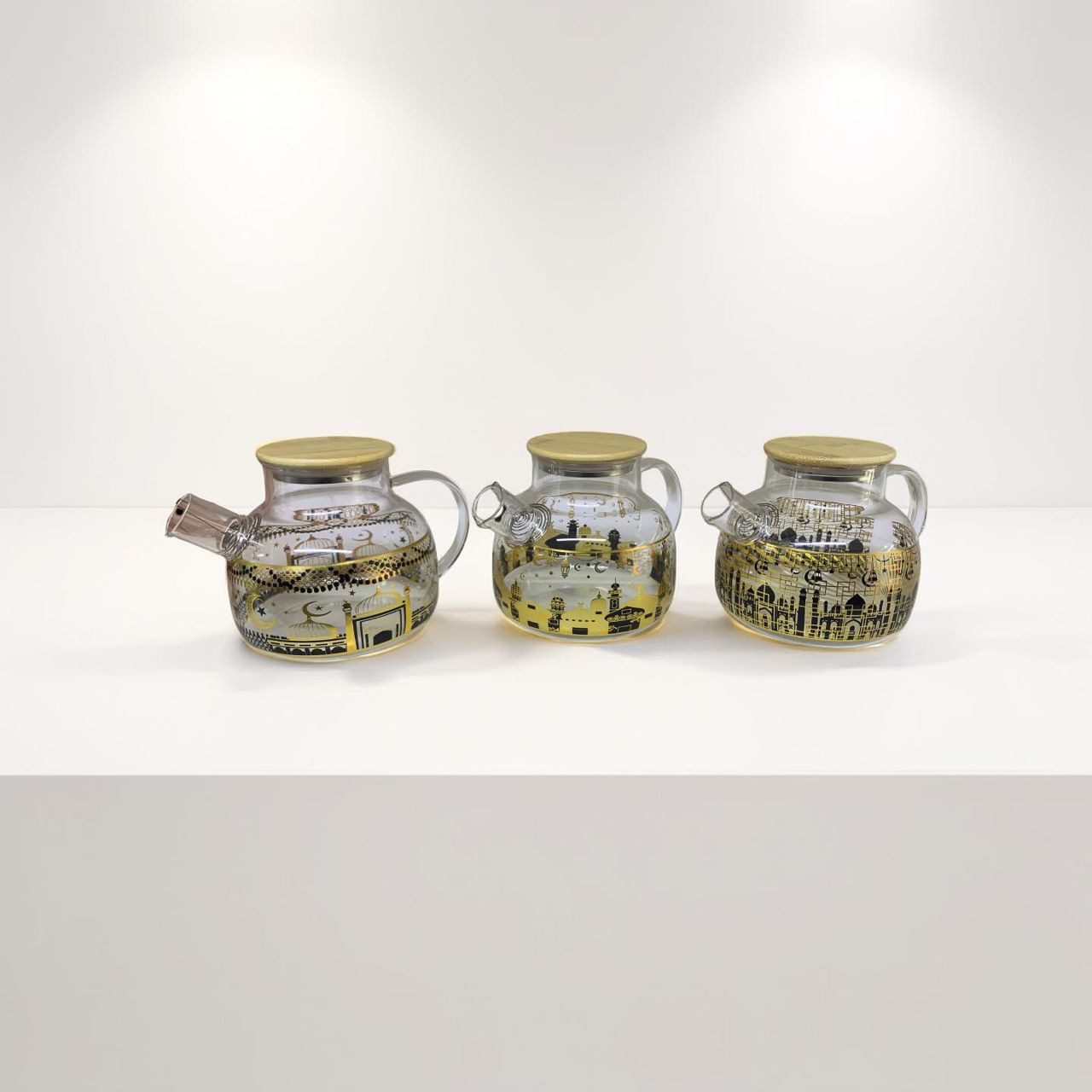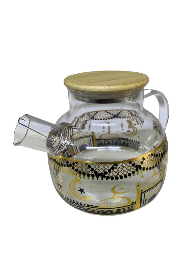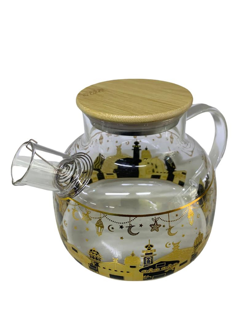 إبريق شاي مصنوع من زجاج شفاف عالي الجودة، مزين بنقوش فنية أنيقة باللونين الذهبي والأسود مستوحاة من الطراز الإسلامي. يتميز بغطاء من الخشب الطبيعي يحافظ على حرارة المشروب ويمنح مظهراً عصرياً وجذاباً. مزود بمقبض مريح وفوهة صب عملية تمنع الانسكاب، مما يجعله مثالياً لتقديم الشاي، الأعشاب، أو المشروبات الساخنة في المنزل أو المناسبات الخاصة.