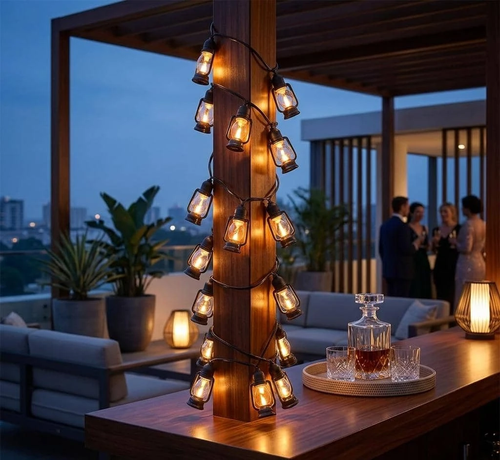 الوصف: هذه الإضاءة تتميز بتصميم مبتكر يشبه الفوانيس القديمة، مع لمبات LED داخل كل فانوس. الإضاءة توفر جوًا دافئًا ومريحًا بفضل اللون البرتقالي الناعم الذي تصدره. إنها مثالية للديكورات الداخلية أو لتزيين المساحات الخارجية في الحفلات أو المناسبات. تأتي الإضاءة مع صندوق تسويقي يحتوي على تفاصيل المنتج.