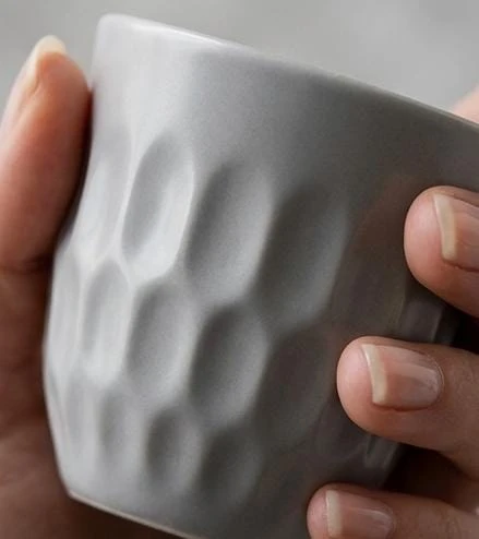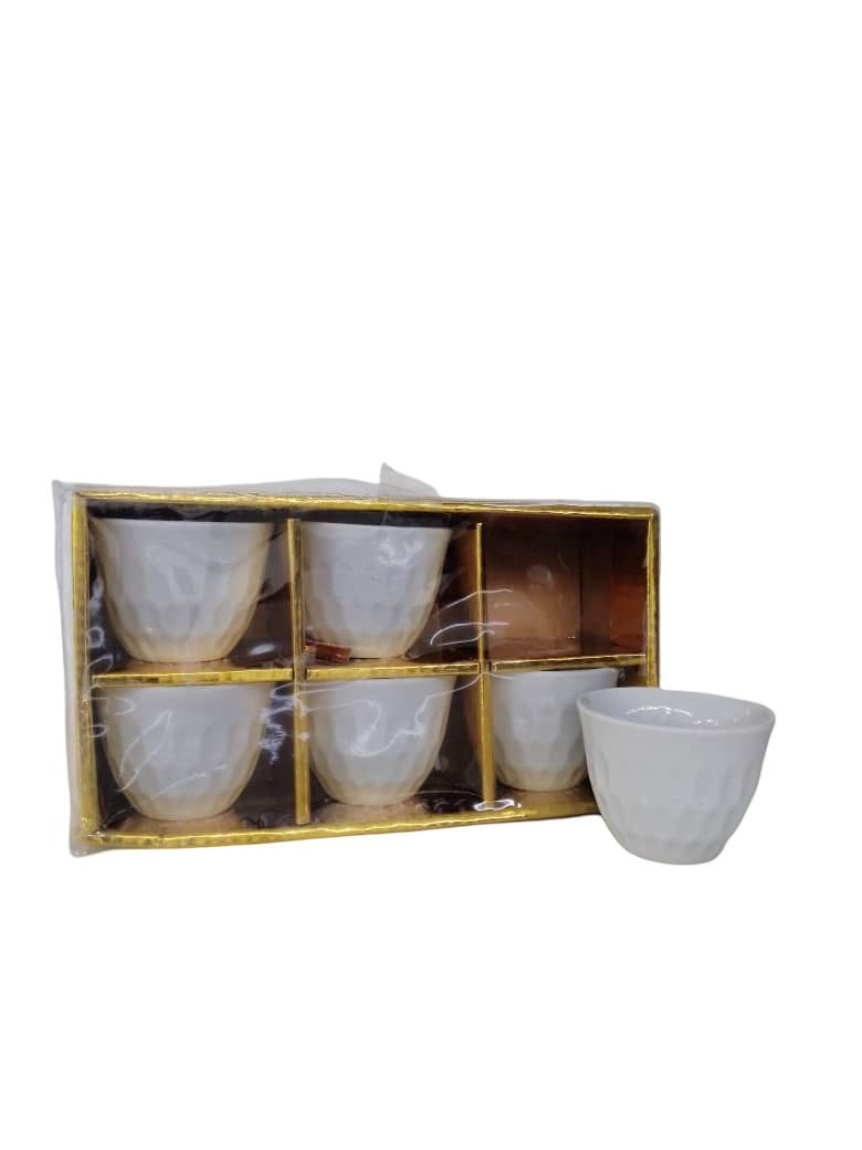 هذه صورة لمجموعة من الأكواب البيضاء الصغيرة. المجموعة تتضمن 6 أكواب داخل علبة أنيقة ذات لون ذهبي على الحواف. الأكواب مصممة بشكل هندسي مع تفاصيل محفورة على السطح الخارجي. هذه الأكواب تبدو مناسبة لتقديم الشاي أو القهوة، وتتميز بتصميم بسيط وأنيق يناسب مختلف الأذواق