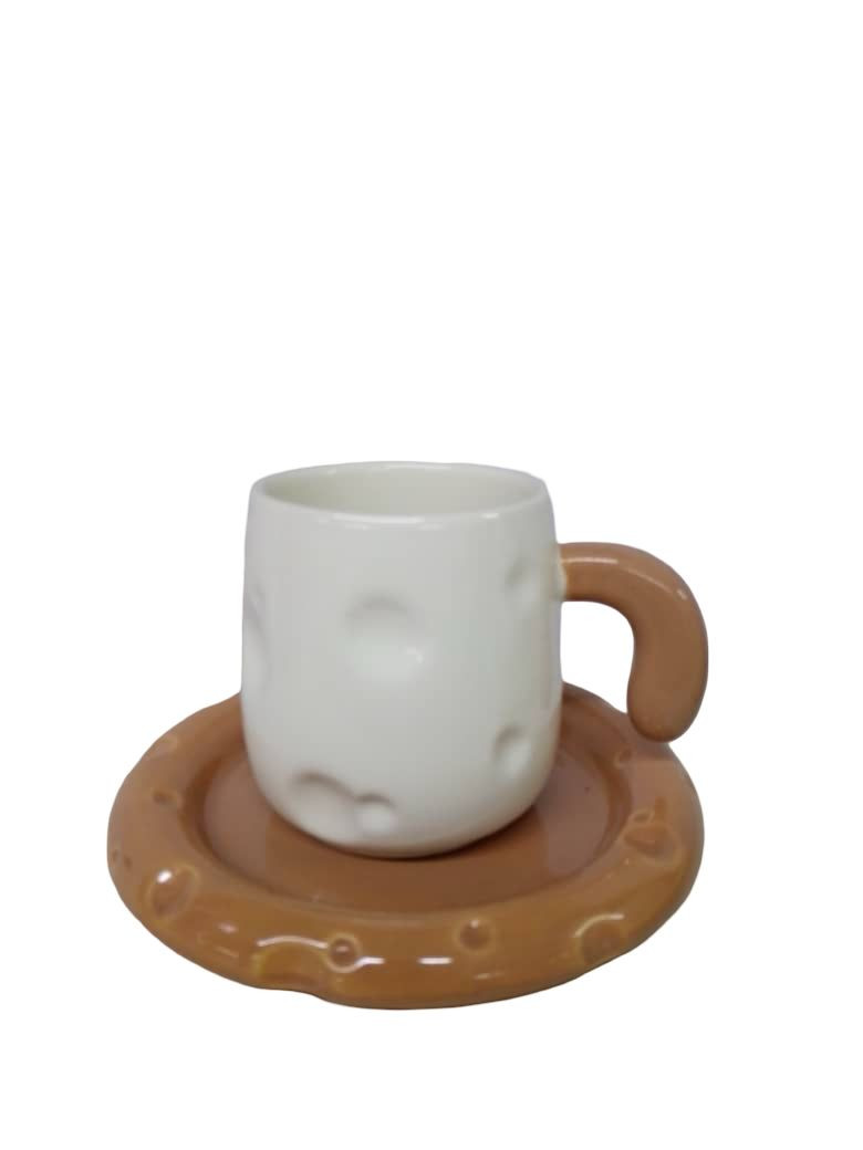 أكواب قهوة فريدة من نوعها مصممة على شكل أكواب ذات مقابض مستوحاة من شكل الجبن، مع صحن متماثل يتناسب مع الأكواب. الأكواب مصنوعة من السيراميك الأبيض الذي يتميز بملمس يشبه الجبن، حيث تحتوي على تفاصيل تجسيدية مثل الثقوب التي تعكس مظهر الجبن. يأتي المنتج في لونين، الأول بني مع صحن بني فاتح، والثاني أخضر مع صحن أخضر فاتح. هذه الأكواب تضيف لمسة من المرح والتصميم العصري على أي مجموعة أكواب، وهي مثالية لمحبي التميز والأشكال الغريبة.