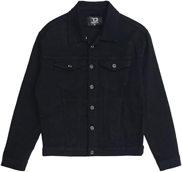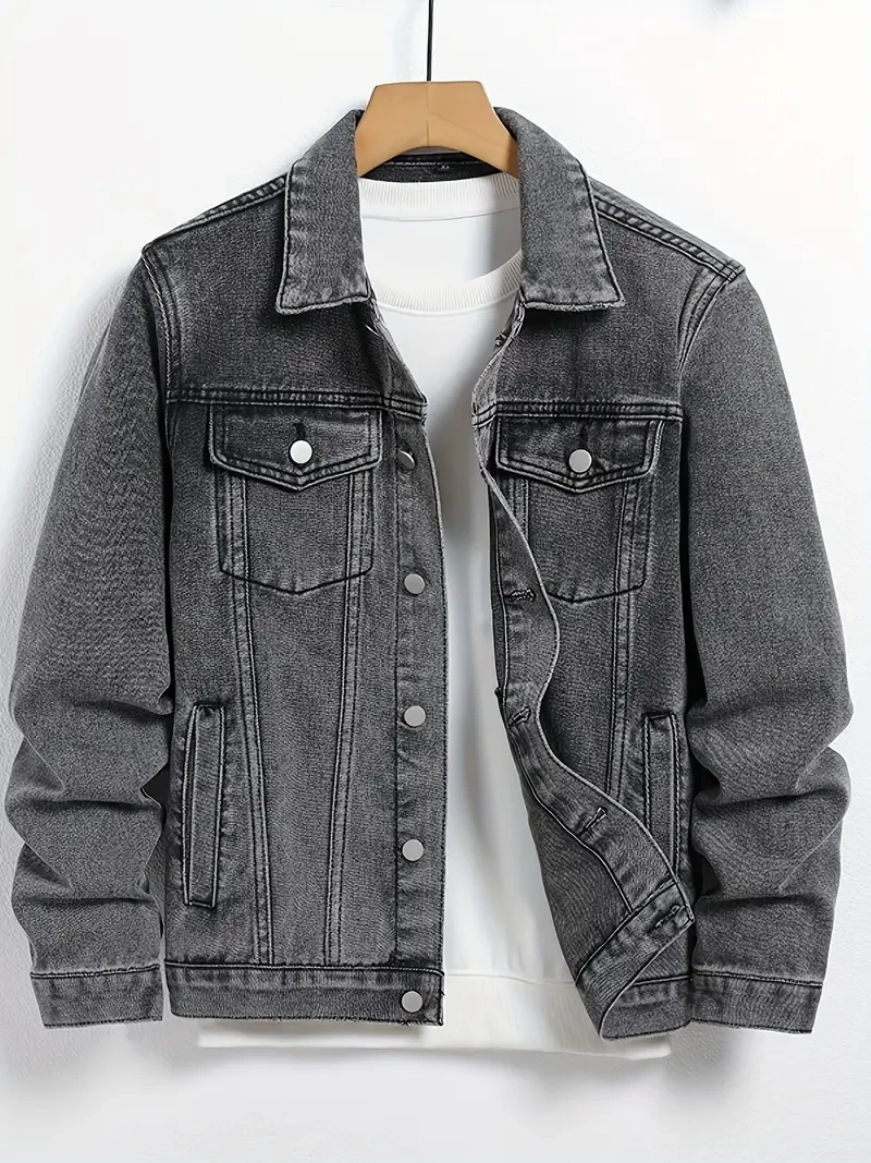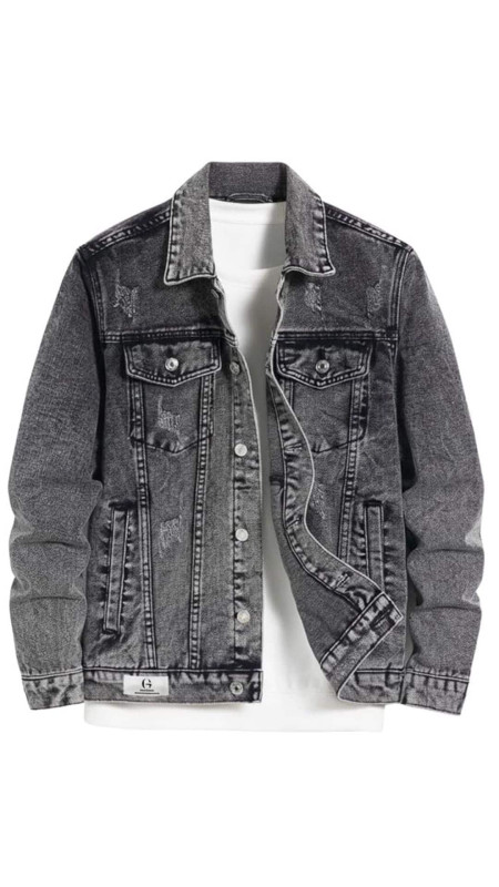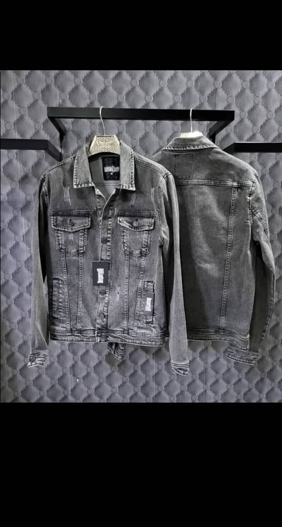 المنتج المعروض في الصورة هو جاكيت جينز رجالي أسود وا رمادي كلاسيكي، ويتميز بالتفاصيل التالية