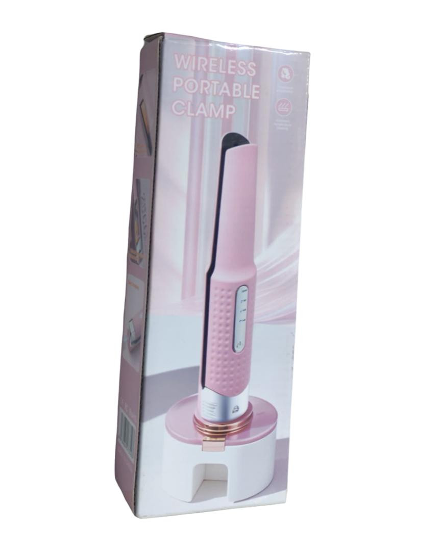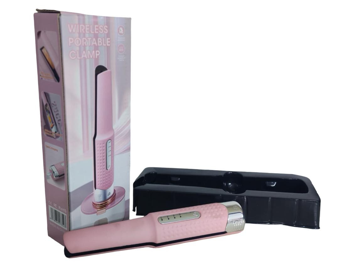 مكواة شعر صغيرة ومحمولة تعمل بدون سلك. قابلة للشحن وتناسب السفر أو الاستخدام السريع خارج المنزل. مصممة لفرد الشعر باستخدام ألواح تسخين داخلية. غالبًا تحتوي على بطارية مدمجة ومؤشرات لدرجة الشحن أو التشغيل.