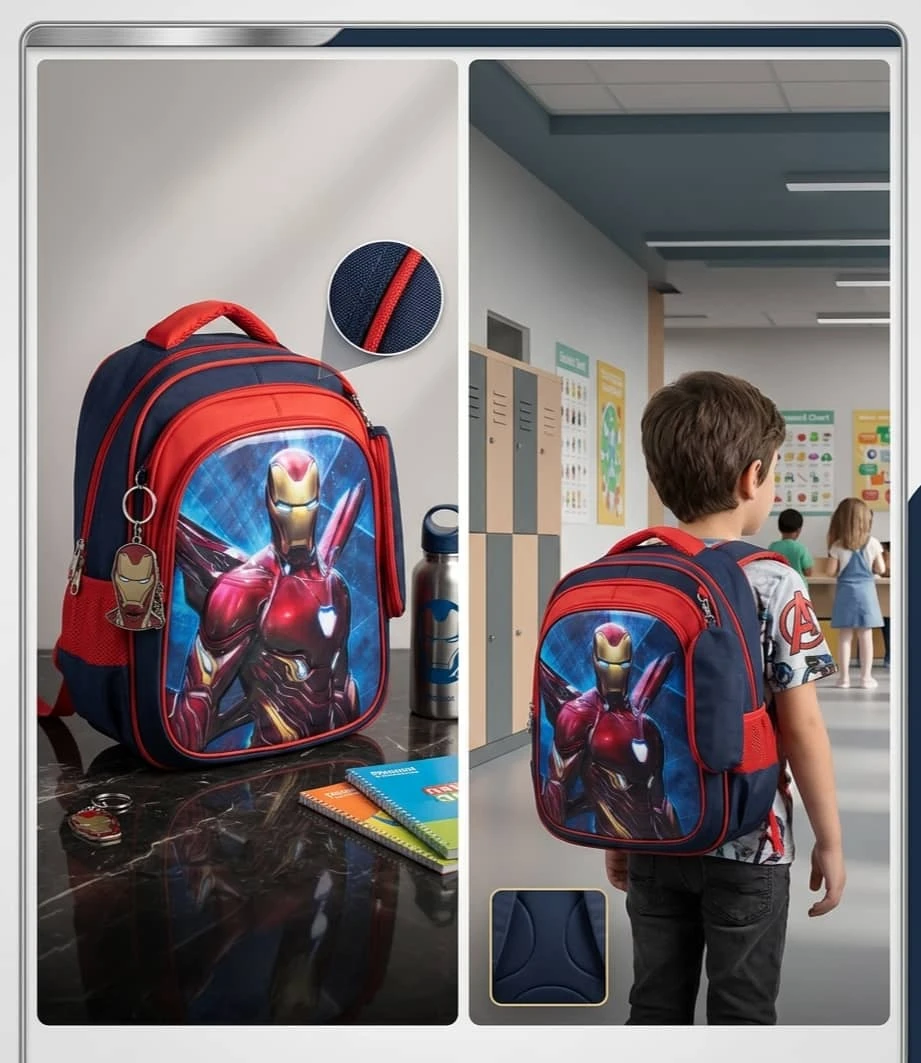حقيبة ظهر للأطفال أو لمحبي شخصية آيرون مان من سلسلة Marvel. تتميز الحقيبة بتصميم جذاب مع صورة كبيرة لشخصية آيرون مان على الجهة الأمامية، مما يجعلها مثالية لعشاق الشخصية. تأتي الحقيبة بلونين أساسيين هما الأحمر والأزرق الداكن، وتحتوي على عدة جيوب لتخزين الأغراض الشخصية. تُعتبر الحقيبة خيارًا ممتازًا للاستخدام اليومي أو للمدرسة.