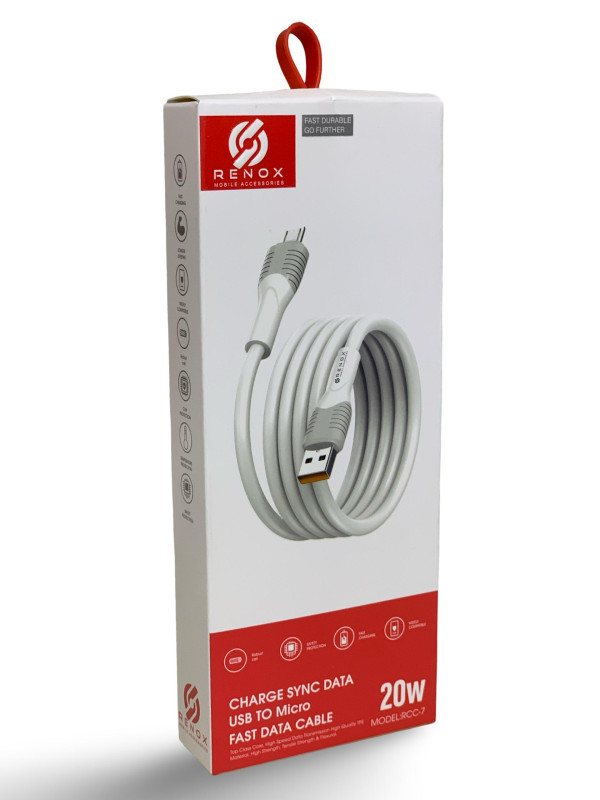 كابل عالي الجودة من شركة Renox مخصص لشحن الأجهزة ونقل البيانات بسرعة وكفاءة. يتميز بتصميم متين ومواد قوية مقاومة للتلف، مما يضمن عمر استخدام طويل. يدعم الشحن السريع بقدرة تصل إلى 20 واط، ويوفر نقل بيانات مستقر وآمن. مناسب للهواتف والأجهزة التي تستخدم منفذ Micro USB، مع حماية مدمجة ضد التيار الزائد وارتفاع الحرارة.