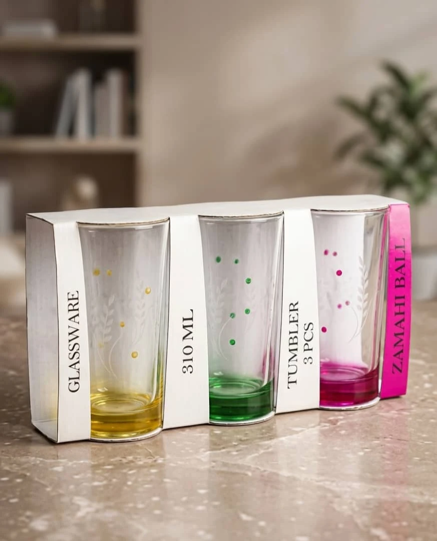 يتميز كل كوب بتصميم عصري حيث يأتي كل كوب بلون مختلف في القاعدة (أحمر، أخضر، وأصفر) مع نقاط ملونة على الجدار، مما يضيف لمسة من البهجة والمرح.