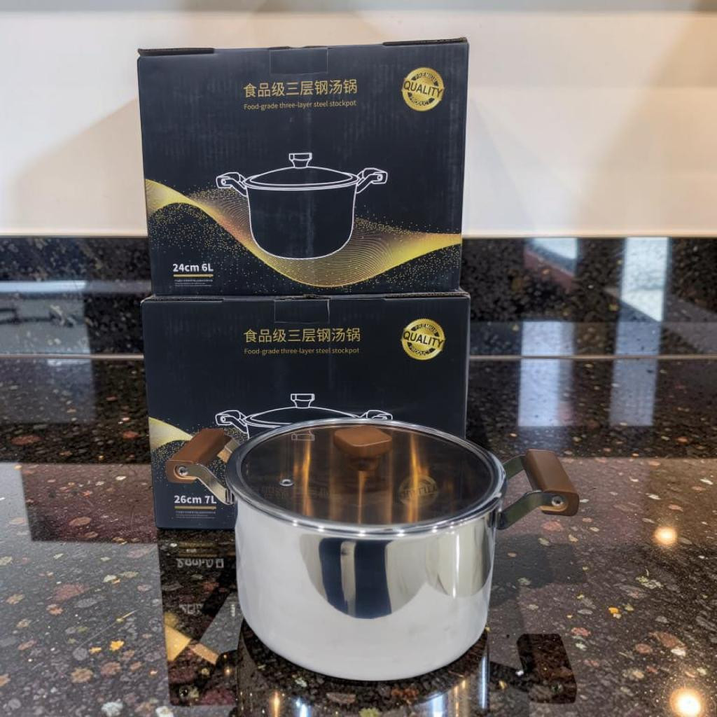 قدر طبخ مصنوع من الفولاذ المقاوم للصدأ بدرجة غذائية، بتصميم ثلاثي الطبقات لتوزيع الحرارة بشكل متساوٍ وسريع. مزوّد بغطاء زجاجي شفاف مع مقبض خشبي أنيق ومقابض جانبية مريحة للحمل. مناسب لتحضير الشوربة، الأرز، المعكرونة واليخنات. يتميز بمتانته وسهولة تنظيفه ومناسب لمعظم أنواع المواقد.