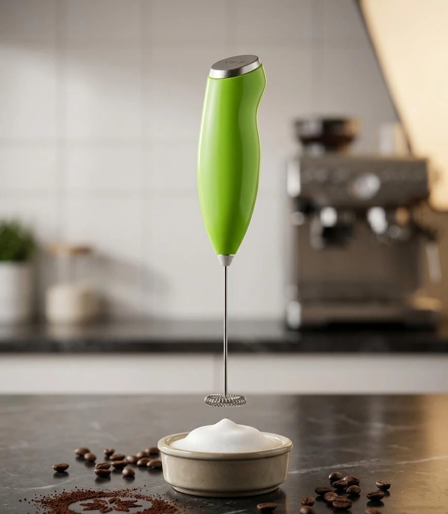هو جهاز كهربائي صغير يستخدم لتحضير رغوة القهوة أو الحليب بسهولة وسرعة. يتميز بمقبض مريح وتصميم عصري بلون أخضر، ويحتوي على محرك كهربائي صغير في الجزء السفلي مع رأس معدني دوار لخلط السوائل بشكل جيد. يمكن استخدامه لتحضير مشروبات مثل الكابتشينو أو اللاتيه عن طريق خفق الحليب أو القهوة الساخنة لعمل رغوة كثيفة.