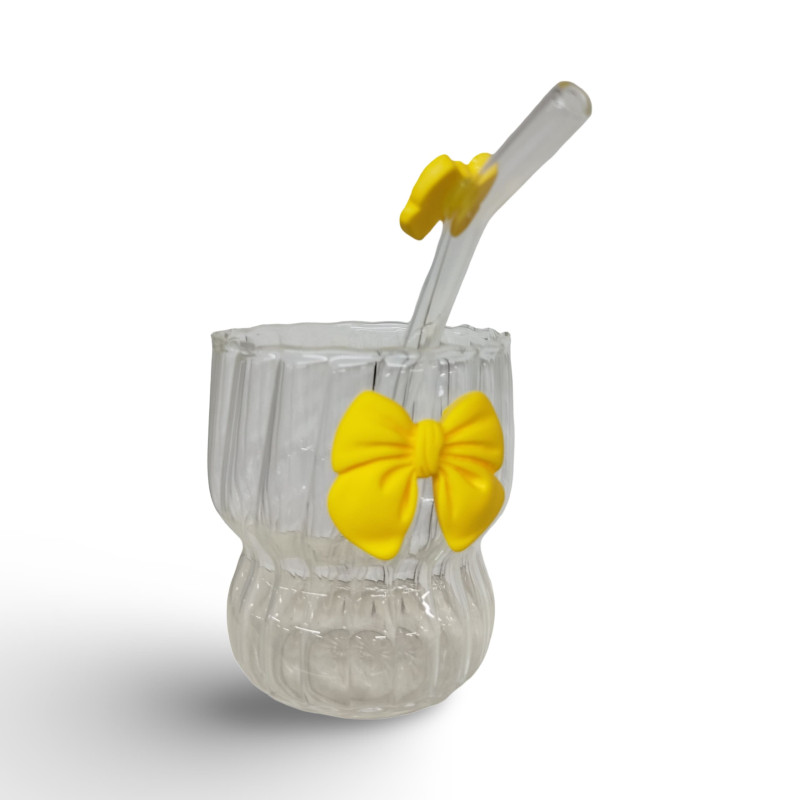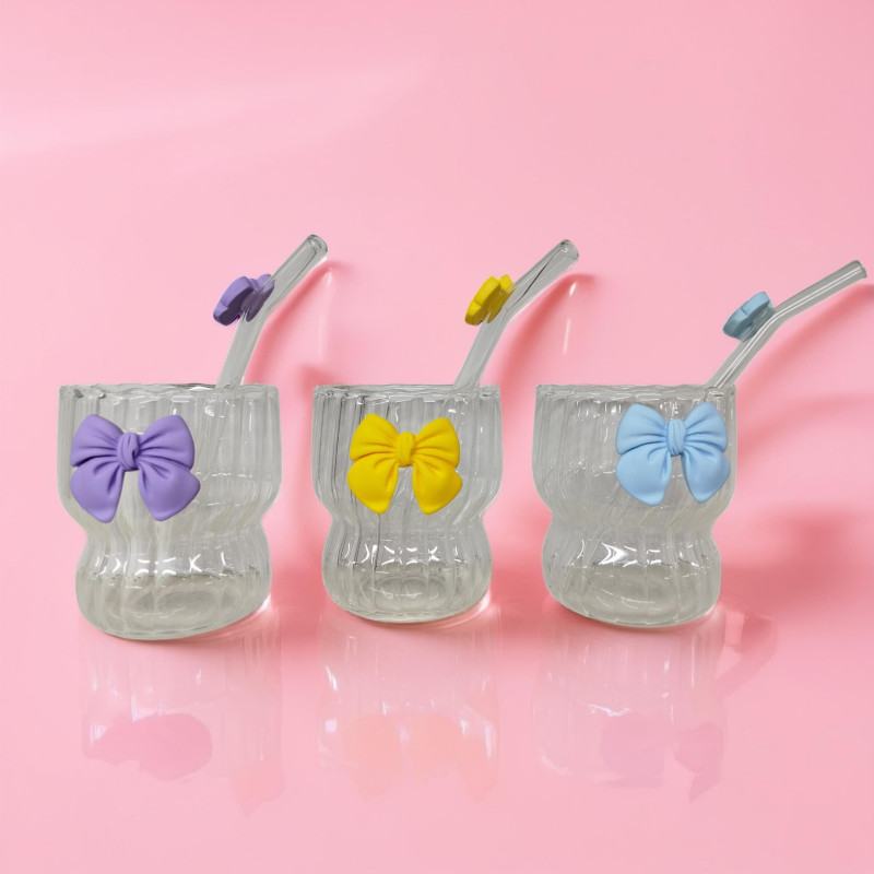 كوب أنيق مصنوع من زجاج شفاف عالي الجودة، يتميز بتصميم عصري مع فيونكة ملونة تضيف لمسة لطيفة وجذابة. يأتي مع شفاط زجاجي مزود بقطعة سيليكون متناسقة اللون لسهولة الاستخدام. مناسب للمشروبات الباردة مثل العصائر، القهوة المثلجة، والمشروبات المنعشة. تصميمه مثالي للاستخدام اليومي أو كهدية مميزة لمحبي التفاصيل الجمالية.