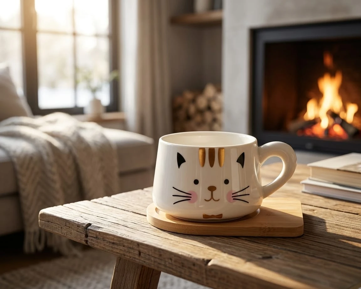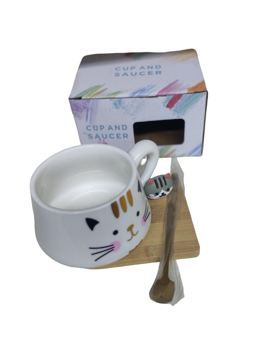 يأتي هذا الكوب الرائع بتصميم لطيف على شكل وجه قطة مع تفاصيل دقيقة مثل الأنف والأذنين. يتضمن الكوب أيضًا صحنًا خشبيًا صغيرًا مزخرفًا برأس قطة صغير، بالإضافة إلى ملعقة خشبية ملفوفة بشكل أنيق. تم تصميم هذا المنتج ليكون هدية مثالية لعشاق القطط أو لمجرد إضافة لمسة من المرح إلى فنجان قهوتك اليومي.