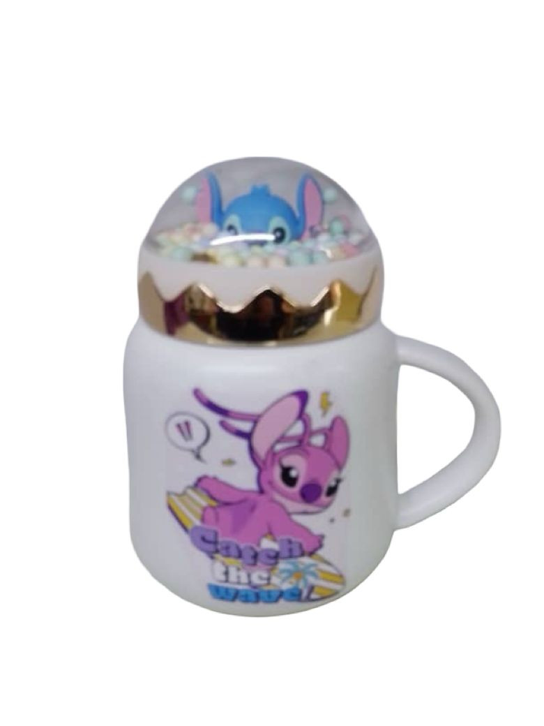 كوب سيراميك مع تصميم لطيف لشخصية ستيتش من فيلم Lilo & Stitch. يحتوي الكوب على قمة مزينة بتفاصيل ملونة مثل حبات الحلوى. يتميز الكوب بحجم مناسب ويأتي مع علبة للتغليف. يضم التصميم رسومًا ملونة لـ ستيتش وهو يركض مع النص "Catch the Wave".