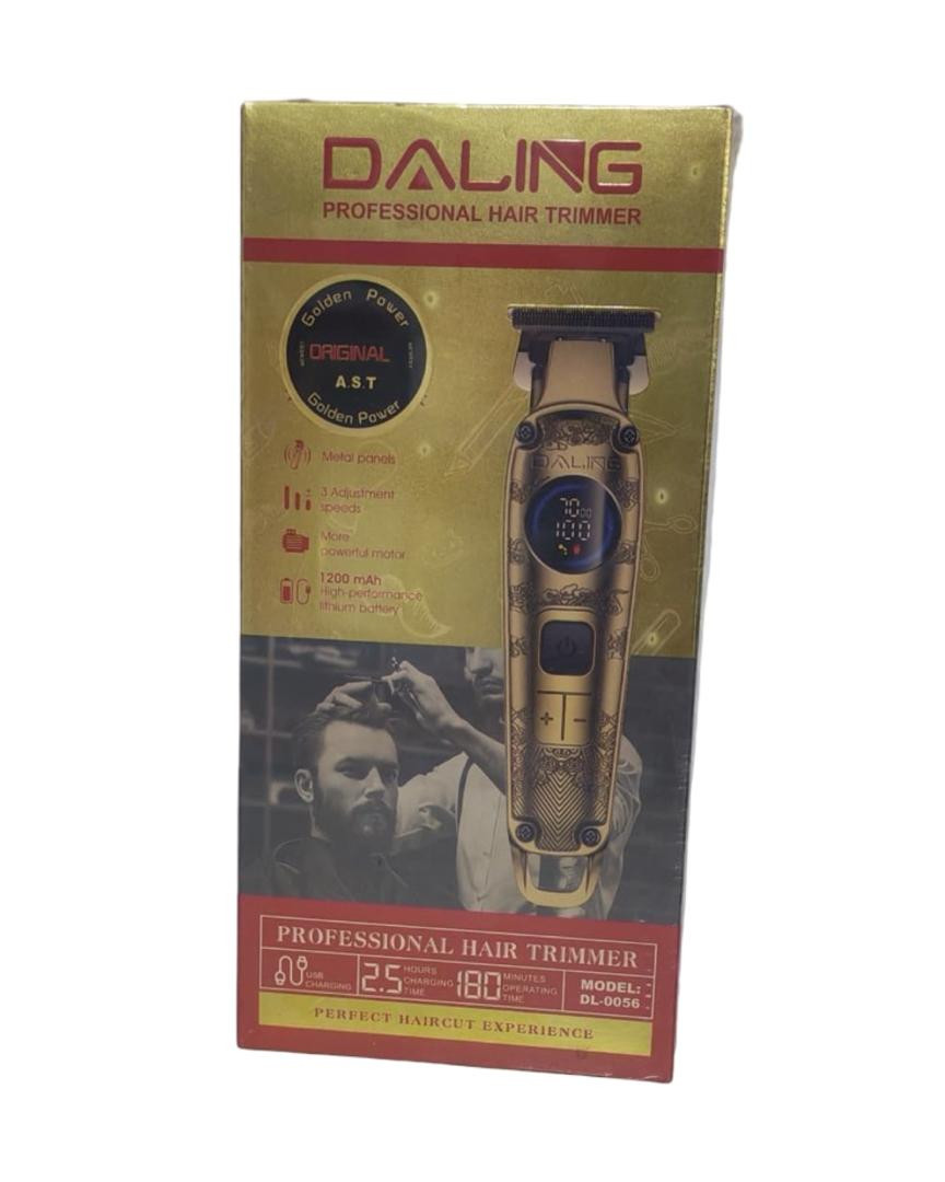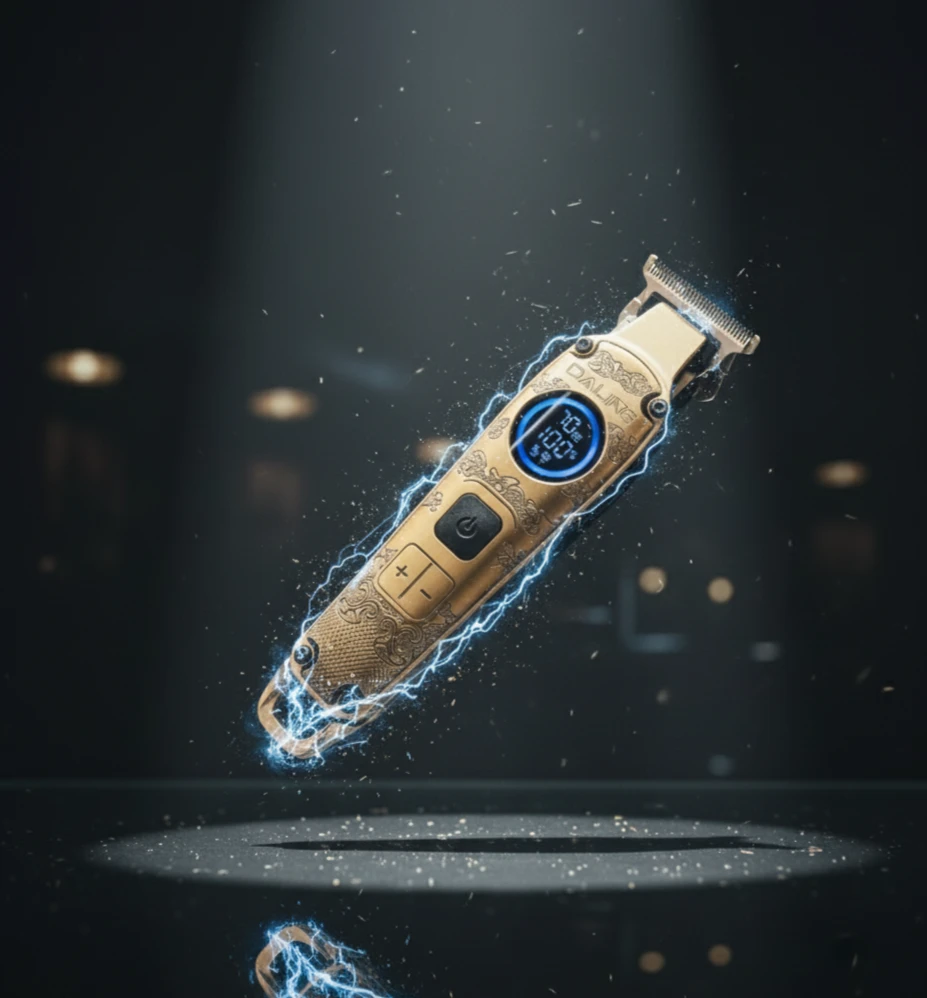 ماكينة حلاقة وتشذيب شعر ولحية احترافية من DALING، تتميز بتصميم أنيق بلون ذهبي وشاشة رقمية لعرض مستوى البطارية. تعمل بمحرك قوي مع إمكانية ضبط السرعة بثلاث مستويات، وتحتوي على بطارية ليثيوم بسعة 1200mAh تدوم حتى 180 دقيقة بعد شحن لمدة 2.5 ساعة. مناسبة للاستخدام المنزلي والصالونات، وتوفر حلاقة دقيقة وسلسة مع أداء عالي.
