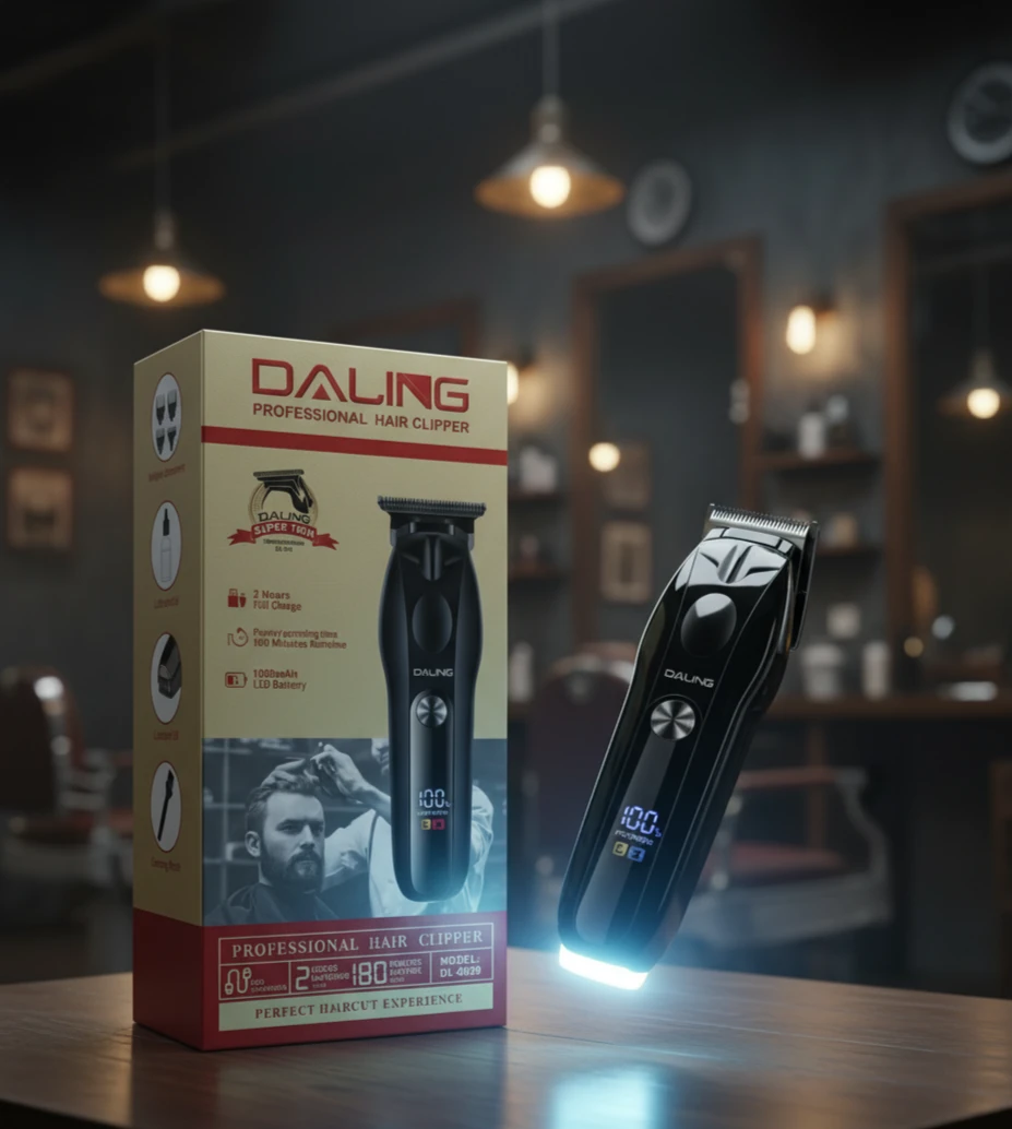 ماكينة حلاقة احترافية من علامة DALING، مصممة للاستخدام المنزلي والصالونات، توفر أداءً قويًا ودقيقًا لقص وتحديد الشعر واللحية. تتميز بتصميم أنيق ومقبض مريح لسهولة التحكم، مع شاشة رقمية لعرض مستوى البطارية.