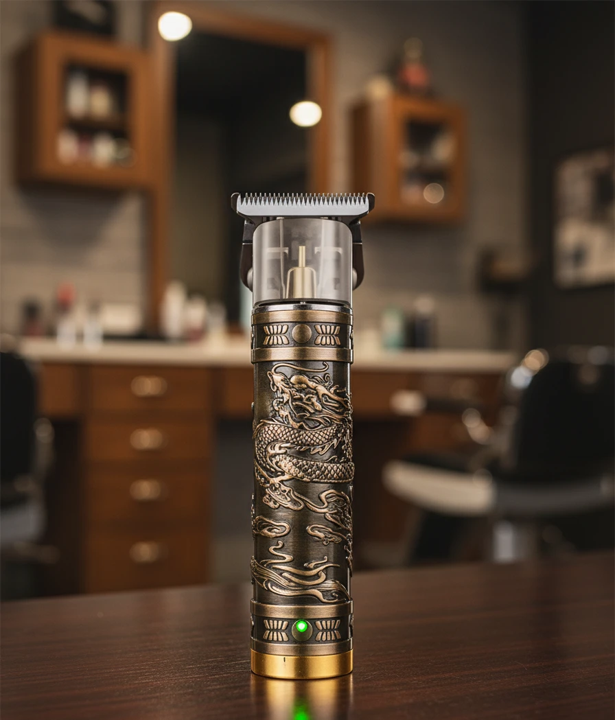 ماكينة حلاقة كهربائية احترافية من شركة DALING، مصممة لقص وتحديد الشعر واللحية بدقة عالية. تتميز بتصميم أنيق مع نقشة فنية على الجسم، وشفرات حادة مقاومة للصدأ لقص سلس بدون سحب أو تهييج.
