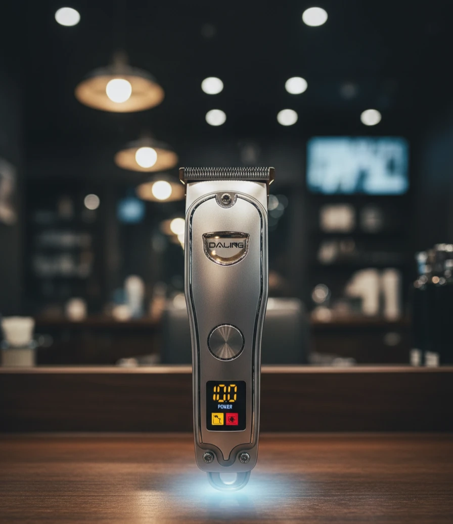 ماكينة حلاقة شعر احترافية من علامة DALING مصممة للاستخدام الشخصي والمهني. تتميز بشفرة حادة عالية الدقة لقص سلس ومتساوٍ، وبطارية قوية تدوم لفترة طويلة، مع شاشة عرض LCD لعرض مستوى الشحن ونسبة الطاقة. تدعم الشحن عبر منفذ USB لسهولة الاستخدام في أي مكان. تصميم أنيق وخفيف الوزن يمنح تحكمًا مريحًا أثناء الحلاقة، ومناسبة لتحديد اللحية وقص الشعر بدقة.