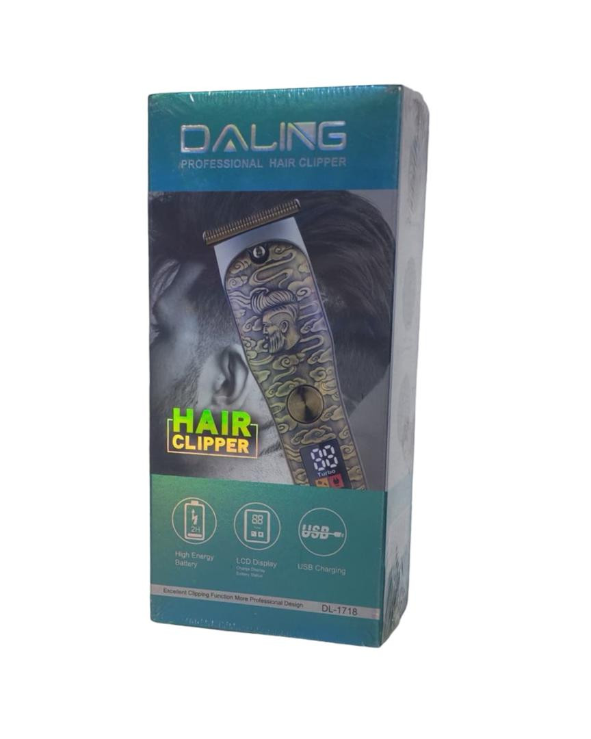 ماكينة حلاقة كهربائية احترافية من شركة DALING، مصممة لقص وتحديد الشعر واللحية بدقة عالية. تتميز بتصميم أنيق مع نقشة فنية على الجسم، وشفرات حادة مقاومة للصدأ لقص سلس بدون سحب أو تهييج.