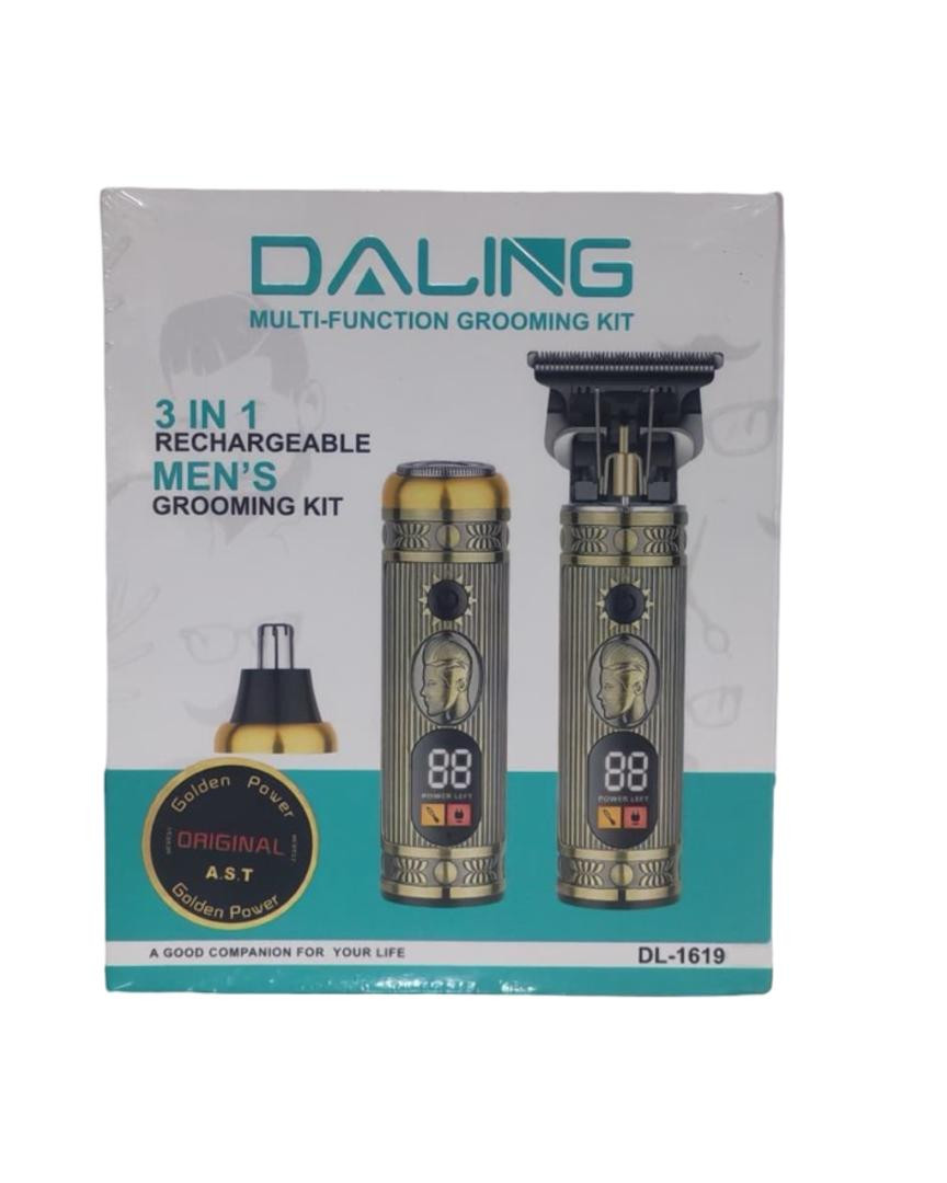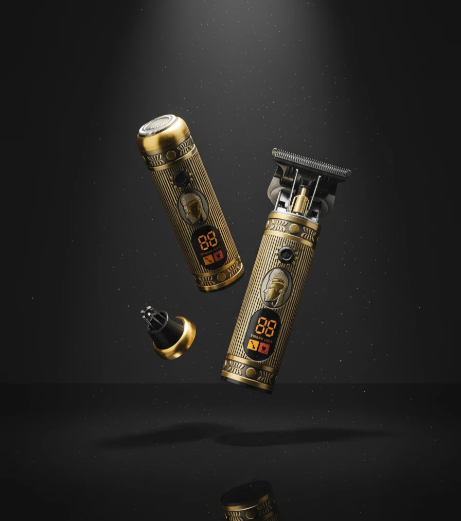 مجموعة حلاقة وتشذيب قابلة لإعادة الشحن، مصممة لتلبية احتياجات العناية الشخصية للرجال. تأتي بثلاثة رؤوس مختلفة لتشذيب اللحية، الشعر، والأنف والأذن، مع شاشة رقمية لعرض مستوى البطارية. تتميز بتصميم أنيق بلون ذهبي، ومحرك قوي للاستخدام السلس والدقيق، كما أنها مناسبة للاستخدام اليومي وفي السفر.