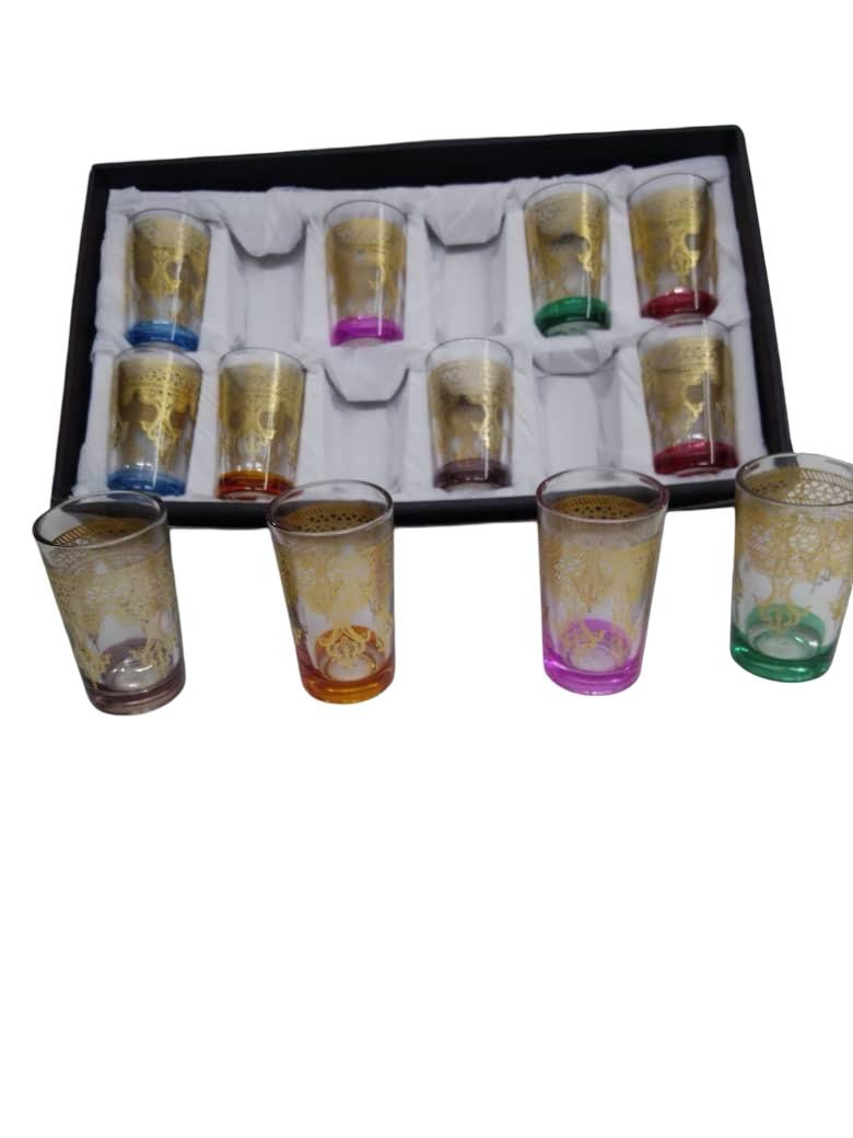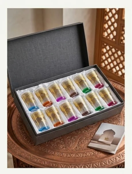 تتكون المجموعة من 12 كوبًا زجاجيًا، كل واحد منهم مزخرف بزخارف ذهبية جميلة. كل كوب يحتوي على لون مختلف في القاعدة، مما يضيف لمسة جمالية وفاخرة. الألوان تشمل الأزرق، البني، الوردي، الأحمر، الأخضر، وغيرها من الألوان الجذابة. هذه المجموعة تعتبر مثالية للاستخدام في المناسبات الخاصة أو كهدايا فاخرة.