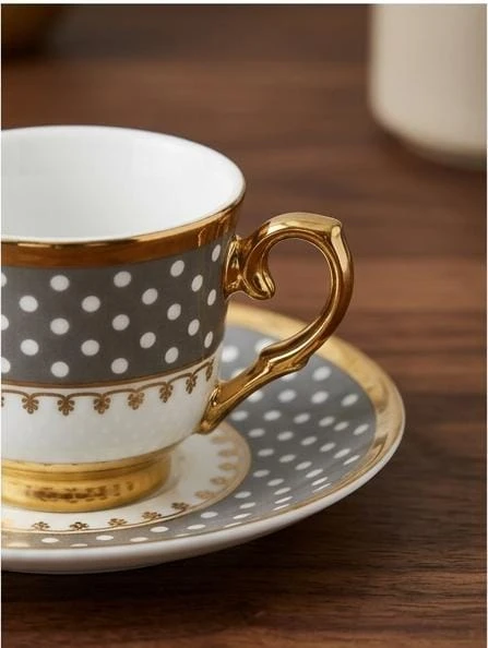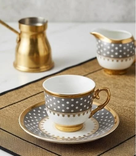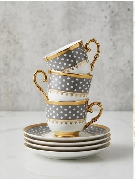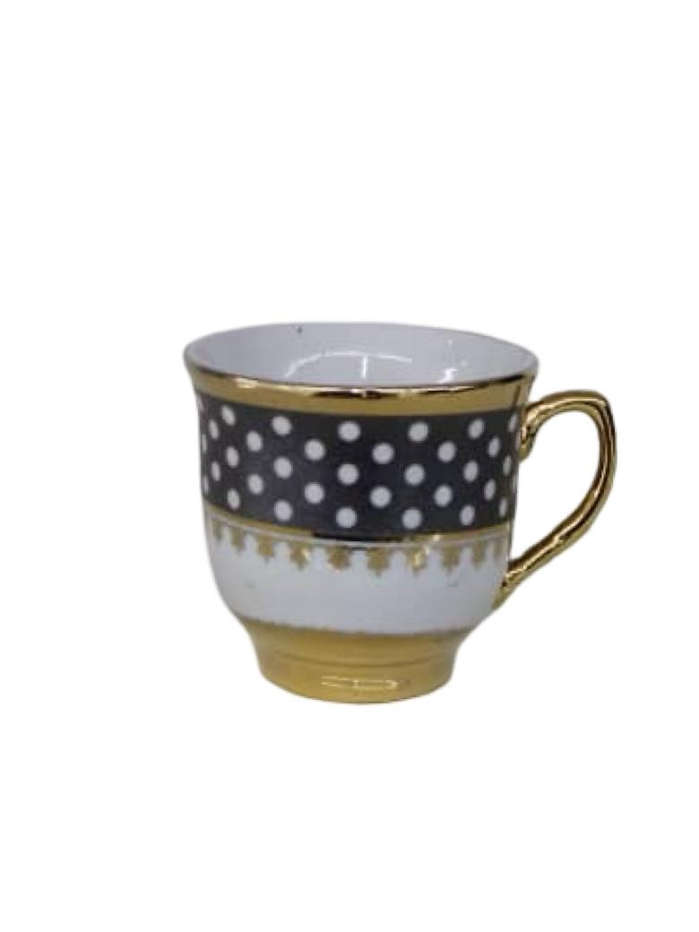 استمتع بأجواء من الفخامة والذوق الرفيع مع مجموعة فناجين القهوة ذات التصميم الأنيق والمميز. تحتوي المجموعة على 12 فنجان قهوة مع الصحون المتناسقة، جميعها مزخرفة بنقاط بيضاء على خلفية رمادية ناعمة، وتزيّنها تفاصيل ذهبية تبرز جمال كل قطعة. سواء كنت تستمتع بقهوتك الصباحية أو تستضيف الأصدقاء، هذه المجموعة ستضفي لمسة من الأناقة والذوق الرفيع على كل لحظة.