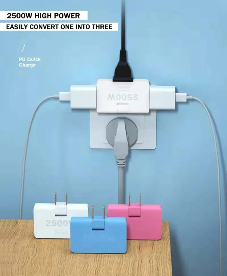 محول كهربائي عصري قدرة تحمل تصل إلى \(2500\text{W}\) و \(10\text{A}\). الميزات: تصميم دوار \(180\) درجة لتناسب المساحات الضيقة. الاستخدام: يحول منفذًا واحدًا إلى ثلاثة منافذ لتشغيل أجهزة متعددة بسهولة.