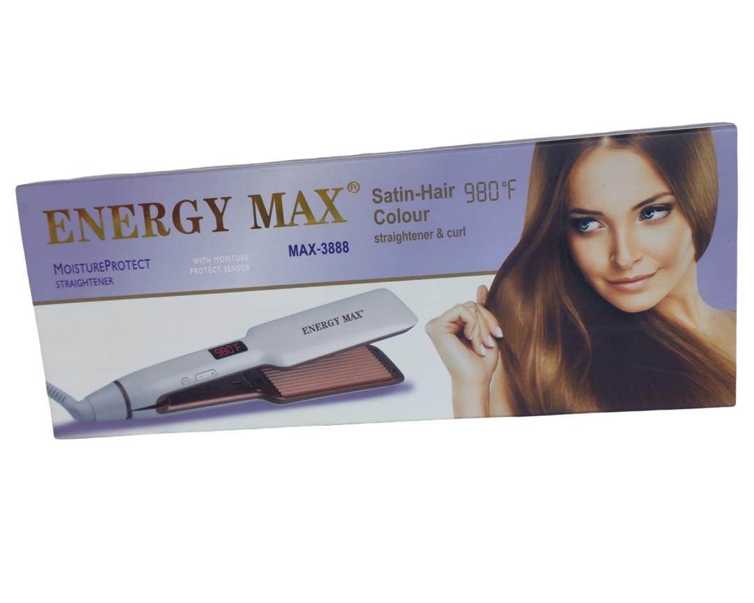 مكواة شعر من ENERGY MAX مخصصة لفرد الشعر وعمل التمويج (Straightener & Curl). تتميز بتقنية Moisture Protect للمساعدة في الحفاظ على رطوبة الشعر وتقليل التلف الناتج عن الحرارة. تصل درجة حرارتها القصوى إلى 980°F، مع ألواح مصممة لتوزيع الحرارة بشكل متساوٍ، ما يساعد على فرد الشعر بسرعة أو تشكيل تموجات ناعمة. تصميم أنيق وسهل الاستخدام، مناسب للاستخدام المنزلي اليومي.