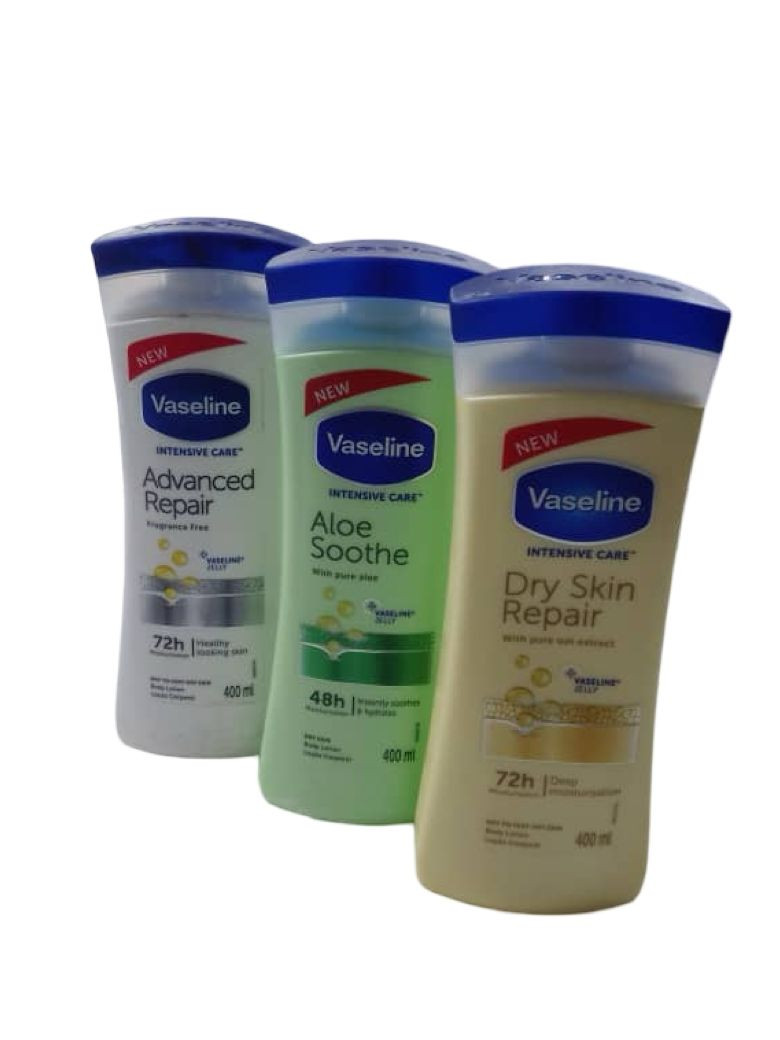 ? 1) Vaseline Advanced Repair الاسم: فازلين أدفانسد ريبير الوصف: مرطب قوي للبشرة شديدة الجفاف والمتشققة، يساعد على إصلاح الجلد وترميمه بعمق، ويوفر ترطيبًا يدوم حتى 72 ساعة. ? 2) Vaseline Aloe Soothe الاسم: فازلين ألو سوت الوصف: مرطب يحتوي على خلاصة الألوفيرا (الصبار)، يهدّئ البشرة ويرطبها، مناسب للبشرة الحساسة ويمنح إحساسًا بالانتعاش، مع ترطيب حتى 48 ساعة. ? 3) Vaseline Dry Skin Repair الاسم: فازلين دري سكن ريبير الوصف: مرطب مخصص للبشرة الجافة، يساعد على استعادة نعومتها ومرونتها، ويمنح ترطيبًا عميقًا يدوم حتى 72 ساعة.