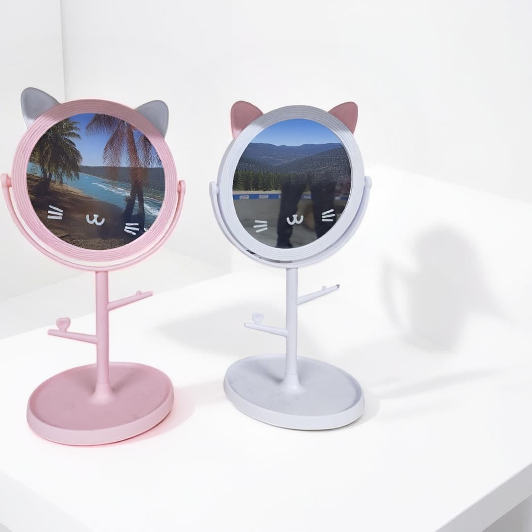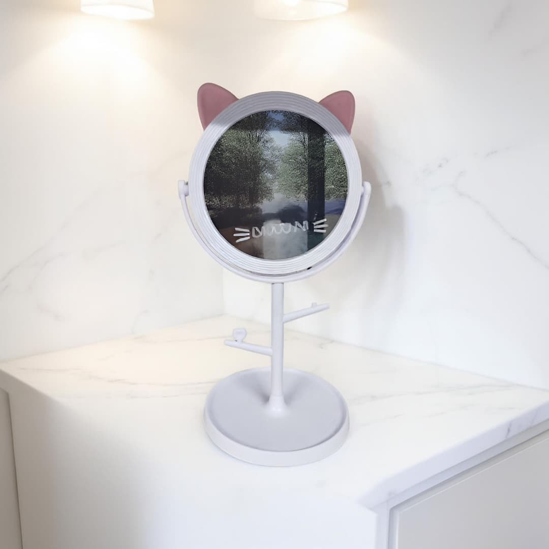 مرآة أنيقة وعصرية بتصميم لطيف على شكل قطة، مزودة بإضاءة LED محيطية تمنحك إضاءة واضحة ومثالية أثناء وضع المكياج أو العناية بالبشرة. تتميز بقاعدة ثابتة مع حامل عملي لتعليق الإكسسوارات مثل الخواتم والأقراط، مما يساعدك على تنظيم أغراضك بسهولة.