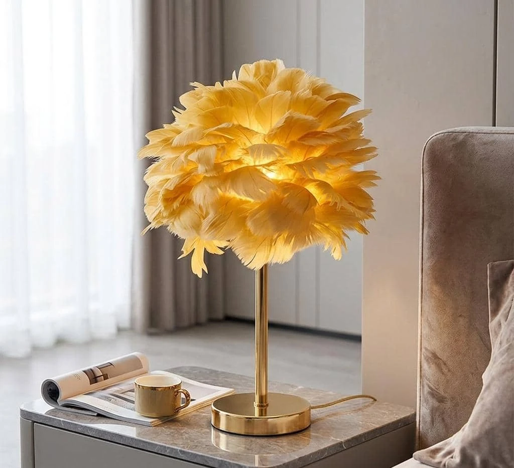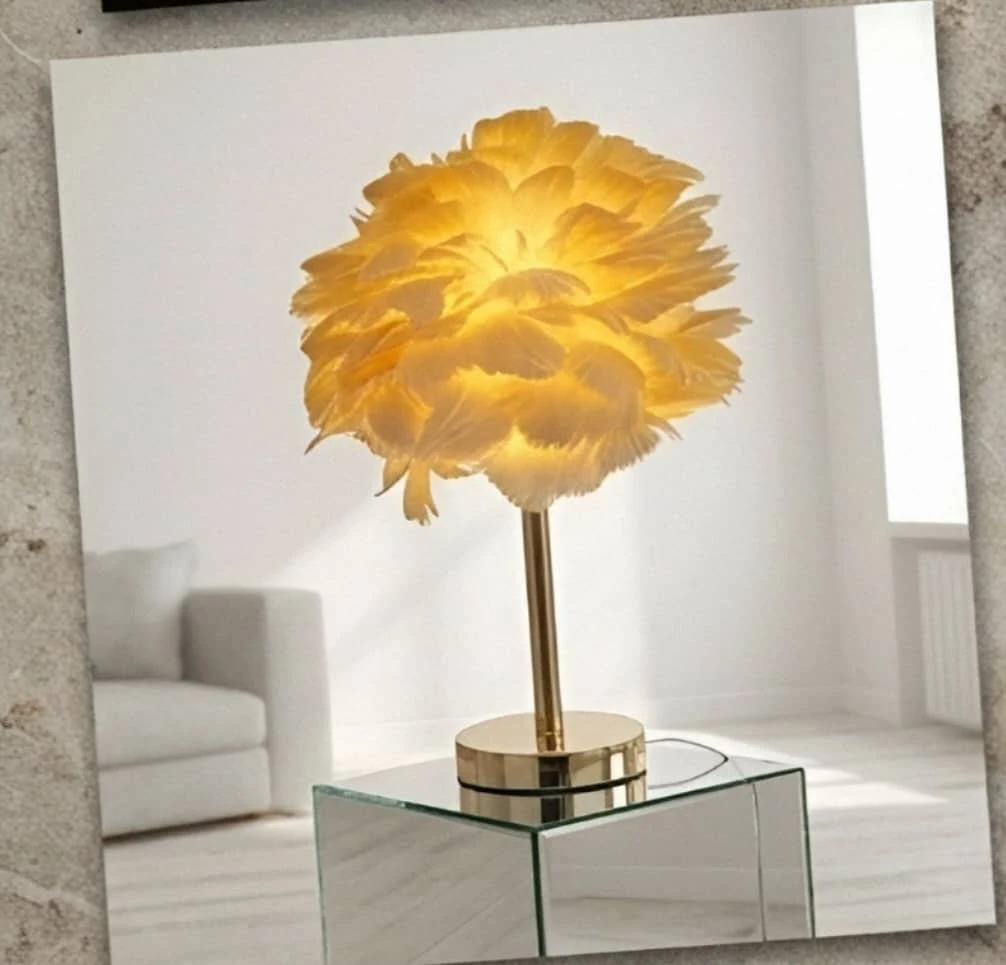 مصباح طاولة ديكوري أنيق بظل مصنوع من الريش الناعم يضفي لمسة جمالية فريدة على الغرفة. قاعدة المصباح معدنية (غالباً مطلية بلون ذهبي)، مع عمود معدني وسلك طاقة. مثالي لغرفة النوم، غرفة الجلوس، أو كقطعة ديكور أنيقة ومضيئة