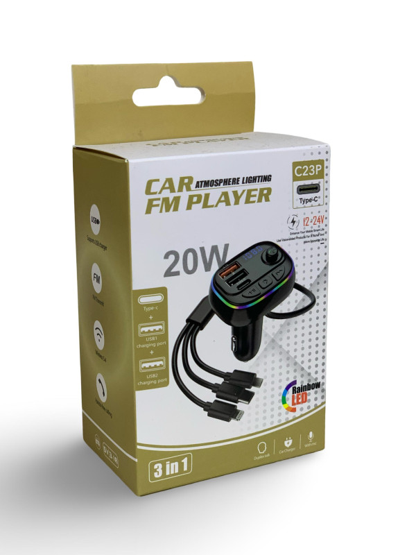 جهاز متعدد الوظائف للسيارة يتيح لك تشغيل الموسيقى والمكالمات عبر راديو FM مع دعم البلوتوث، بالإضافة إلى شحن أجهزتك بسرعة. يتميز بتصميم أنيق مع إضاءة محيطية RGB (Rainbow LED) لإضافة لمسة جمالية داخل السيارة.