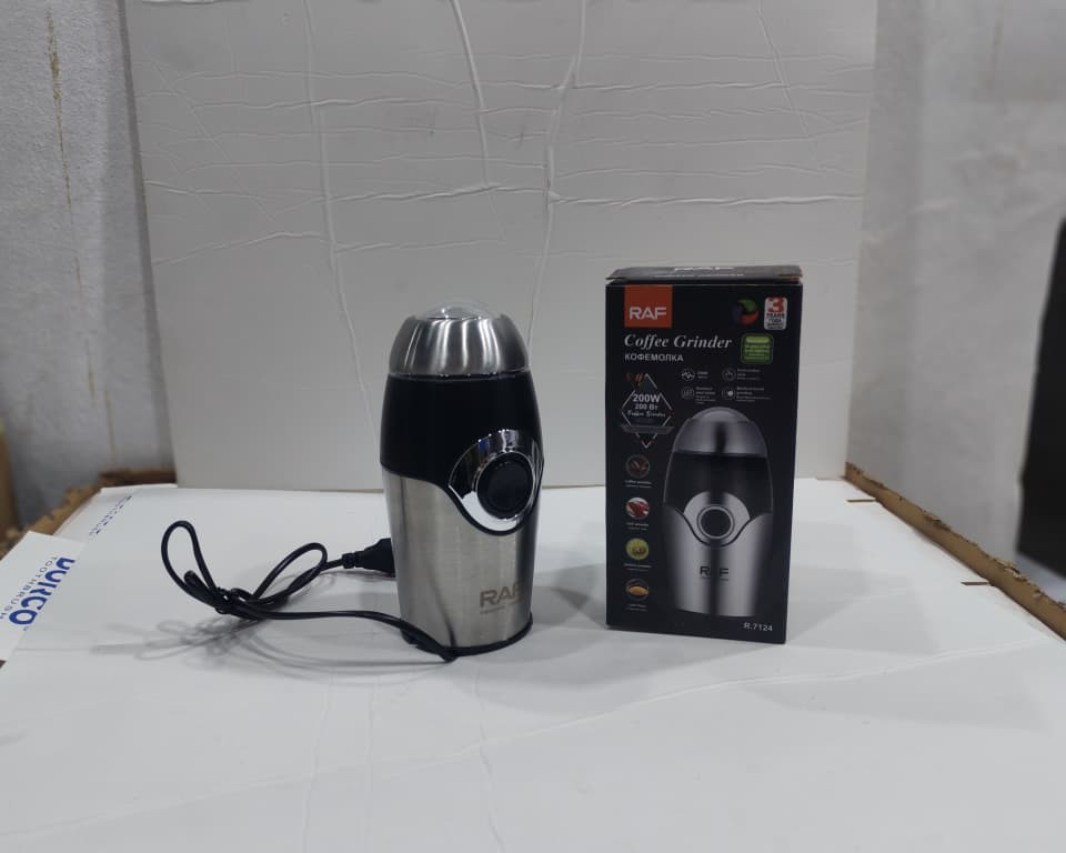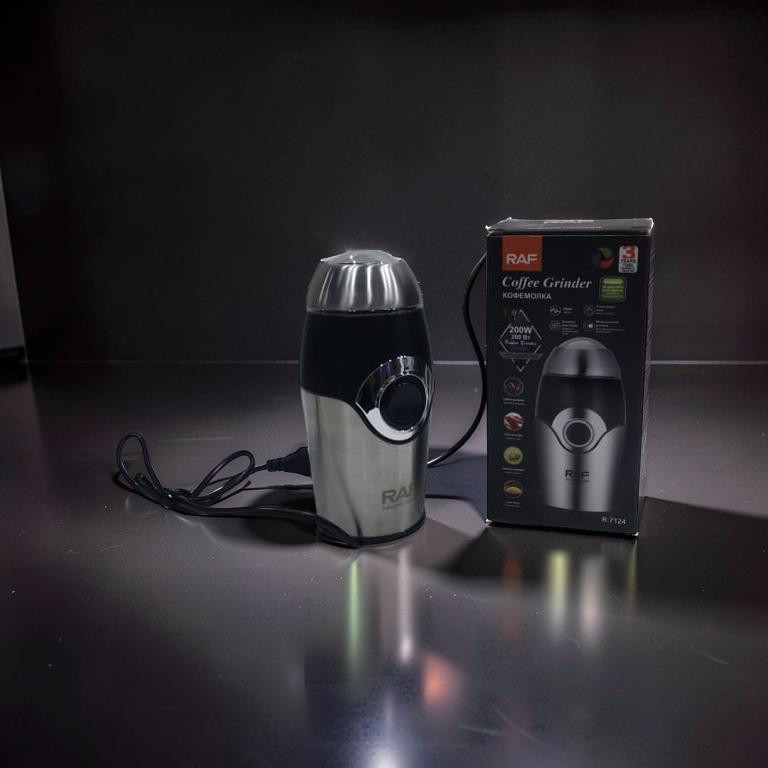 مطحنة قهوة كهربائية من ماركة RAF، مصنوعة من الستانلس ستيل مع تصميم أنيق ومتين. تعمل بقوة 200 واط، ومناسبة لطحن حبوب القهوة، التوابل، والمكسرات بسرعة وكفاءة. تحتوي على شفرة حادة من الستانلس ستيل وغطاء أمان، مع زر تشغيل جانبي لسهولة الاستخدام. تتميز بحجمها الصغير وسهولة تنظيفها، مما يجعلها مناسبة للاستخدام المنزلي اليومي.