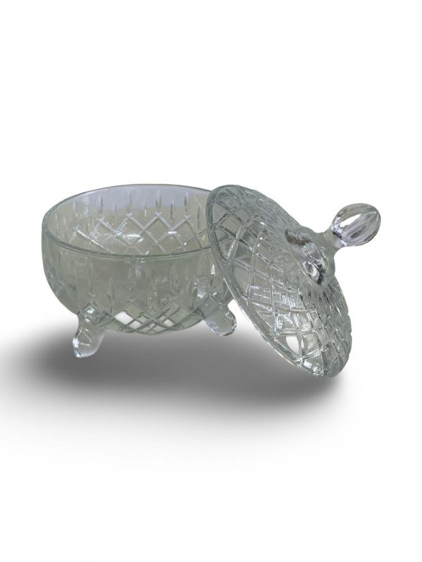 وعاء أنيق مصنوع من الزجاج الشفاف عالي الجودة، بتصميم محفور فاخر وقاعدة صغيرة تمنحه ثباتًا ومظهرًا راقيًا. مزود بغطاء عملي بمقبض لسهولة الفتح والإغلاق، مما يساعد على الحفاظ على المحتويات طازجة ونظيفة.