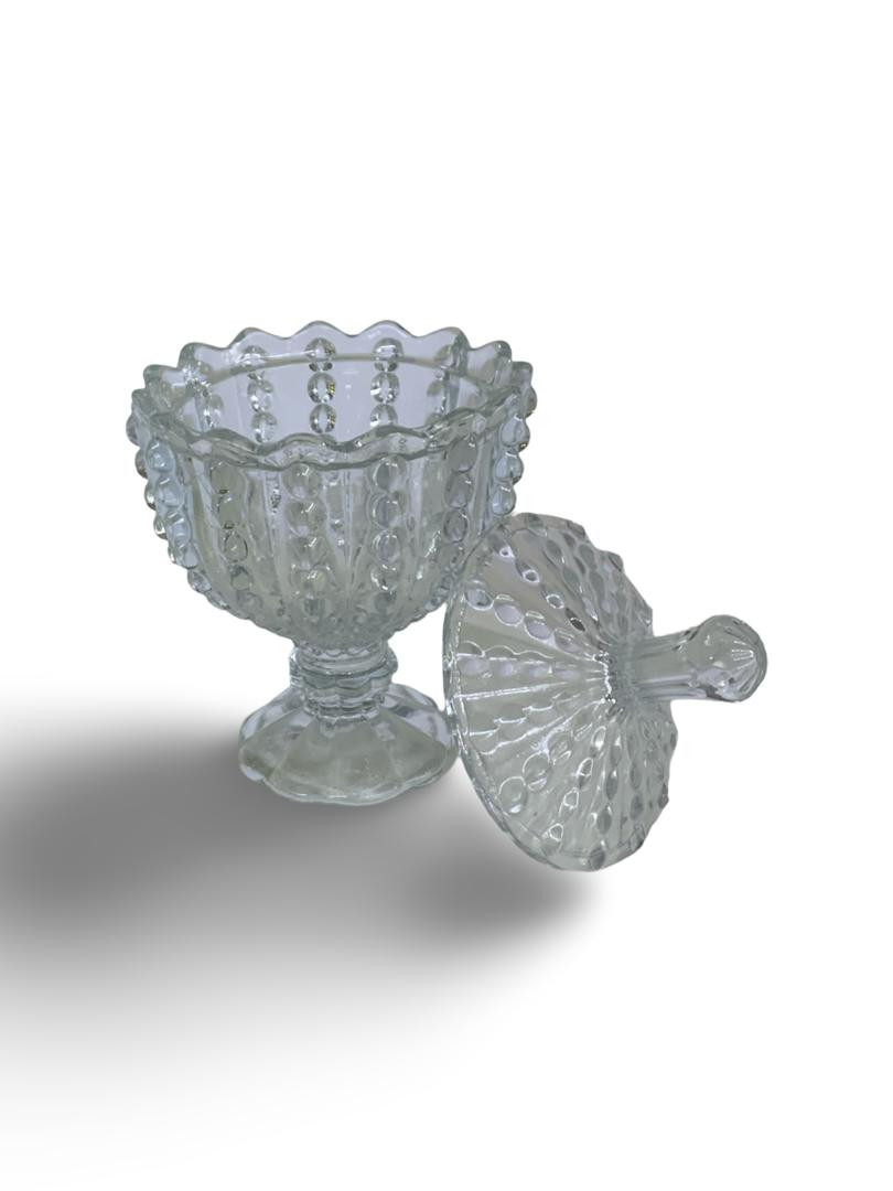 وعاء أنيق مصنوع من الزجاج الشفاف عالي الجودة، بتصميم محفور فاخر وقاعدة صغيرة تمنحه ثباتًا ومظهرًا راقيًا. مزود بغطاء عملي بمقبض لسهولة الفتح والإغلاق، مما يساعد على الحفاظ على المحتويات طازجة ونظيفة.