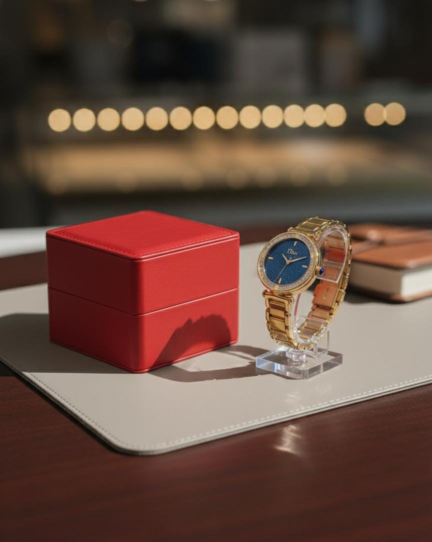 ساعة تجمع بين دفء الذهب الوردي وغموض الميناء الكوني، لتمنح إطلالتكِ لمسة من الفخامة الأنثوية الراقية.
