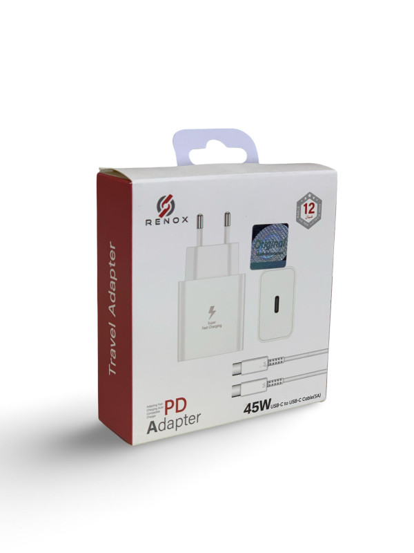 شاحن جداري من شركة RENOX يدعم تقنية الشحن السريع Power Delivery (PD) بقدرة تصل إلى 45 واط، مناسب لشحن الهواتف الذكية، الأجهزة اللوحية، وبعض أجهزة اللابتوب المتوافقة. يأتي بمنفذ USB-C واحد مع كابل USB-C إلى USB-C بقدرة تحمل 5 أمبير، مما يضمن شحنًا سريعًا وآمنًا.