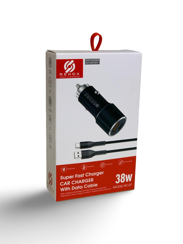 شاحن سيارة عالي الجودة من شركة RENEX، يوفر شحنًا سريعًا وآمنًا بقدرة تصل إلى 38 واط. مزود بمنفذين (USB وType-C) لتمكين شحن جهازين في نفس الوقت، ويأتي مع كابل بيانات مرفق لسهولة الاستخدام. يتميز بنظام حماية من زيادة الجهد والحرارة والتيار، مما يضمن أداءً مستقرًا وعمرًا أطول للأجهزة. مناسب للهواتف الذكية والأجهزة اللوحية وغيرها أثناء القيادة.