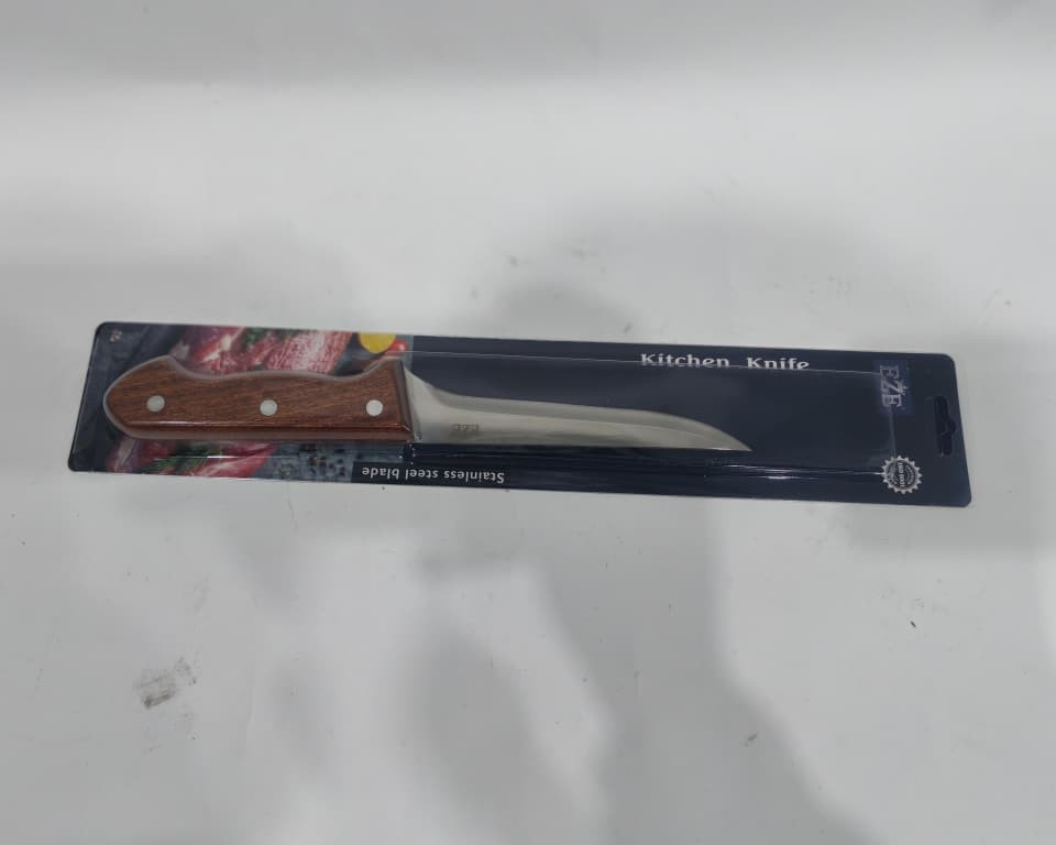 سكين مطبخ عالي الجودة مصنوع من فولاذ مقاوم للصدأ لضمان المتانة والحفاظ على حدّة الشفرة لفترة طويلة. يتميز بمقبض خشبي مريح مزوّد بمسامير تثبيت لثبات أفضل أثناء الاستخدام. مناسب لتقطيع اللحوم والخضروات والفواكه، ويعد خيارًا عمليًا للاستخدام اليومي في المطبخ. يأتي مغلفًا بعبوة بلاستيكية للحماية والعرض.