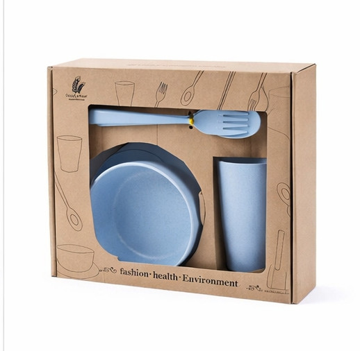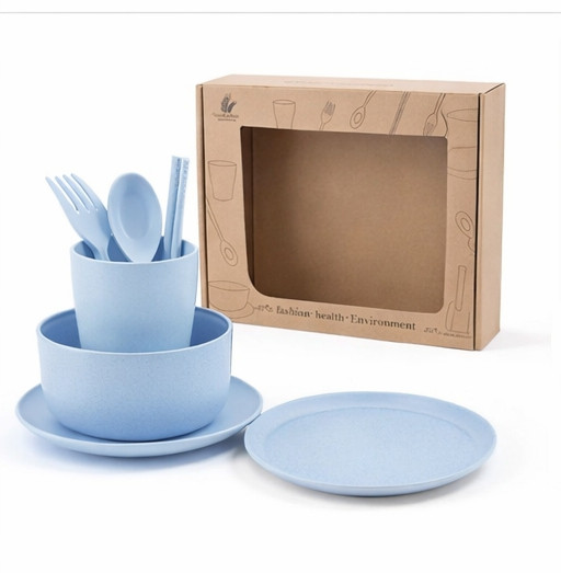يأتي الطقم داخل علبة كرتونية أنيقة ذات تصميم بسيط يعكس الطابع البيئي للمنتج، ما يجعله مناسبًا أيضًا كهدية. اللون الأزرق يعطي إحساسًا بالنظافة والهدوء، ويتناسق مع مختلف ديكورات المطبخ أو الرحلات الخارجية.