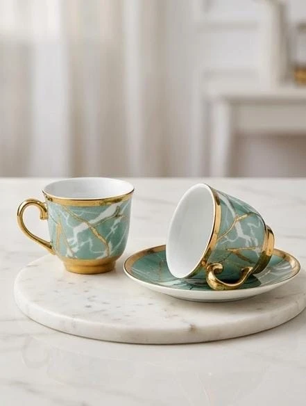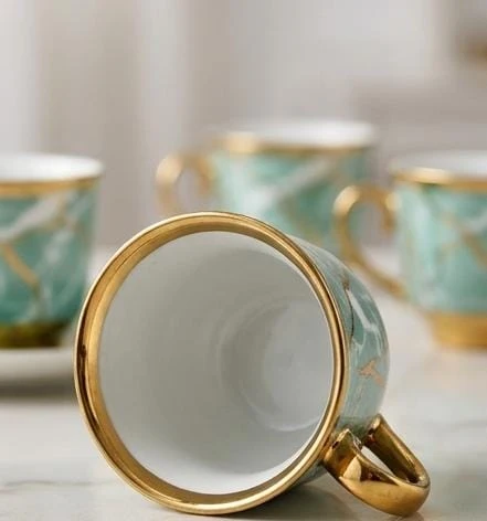 ليوفر لك تجربة شاي أو قهوة استثنائية. يتضمن هذا الطقم 6 أكواب مع 6 صحون صغيرة، جميعها مزينة بتصميم عصري من خطوط ذهبية لامعة على قاعدة بلون أخضر هادئ، ما يجعله خيارًا مثاليًا للمناسبات الخاصة أو لتزيين طاولتك في كل يوم.