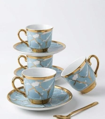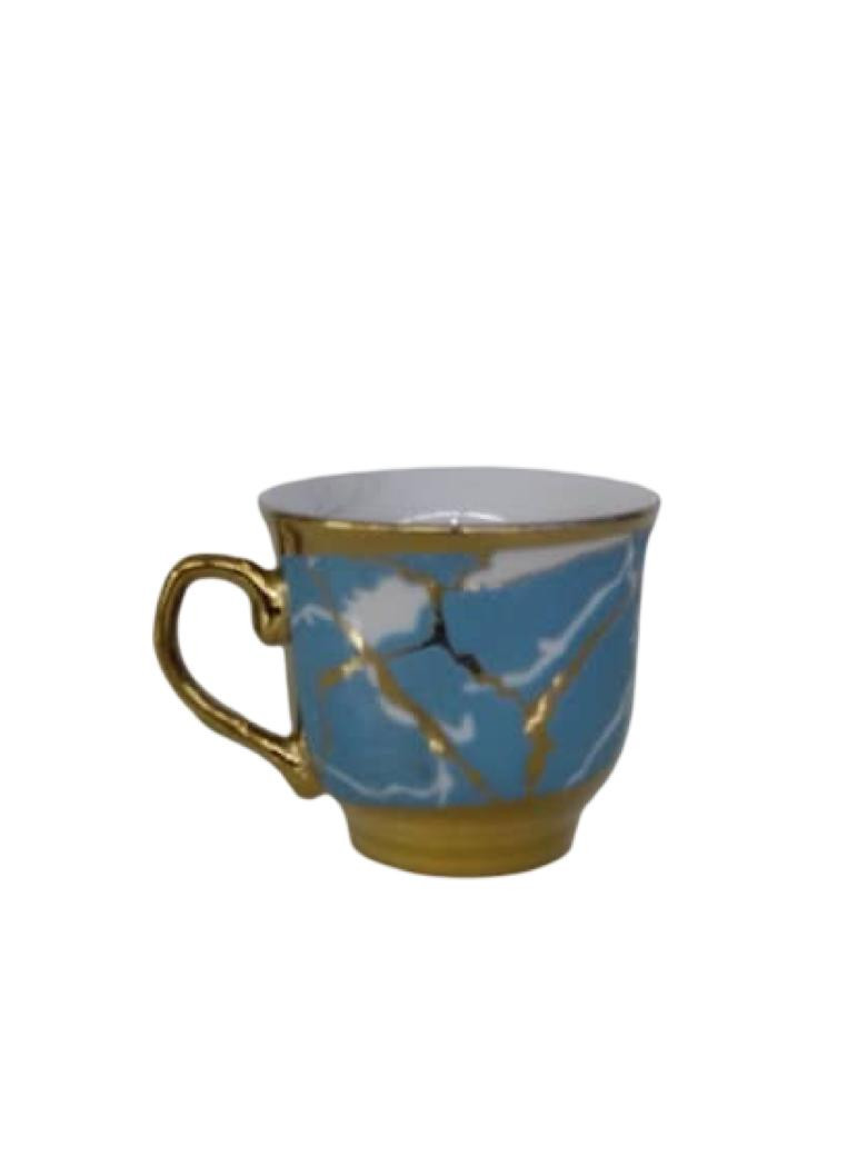 اللمسة الذهبية المتناغمة مع اللون الأزرق تخلق مزيجًا من الأناقة التي تجعل كل تناول للمشروب تجربة مميزة. مصنوع من أجود أنواع الخزف، مما يضمن لك طقمًا متينًا وآمنًا للاستخدام اليومي أو كهدية فاخرة لأحبائك.