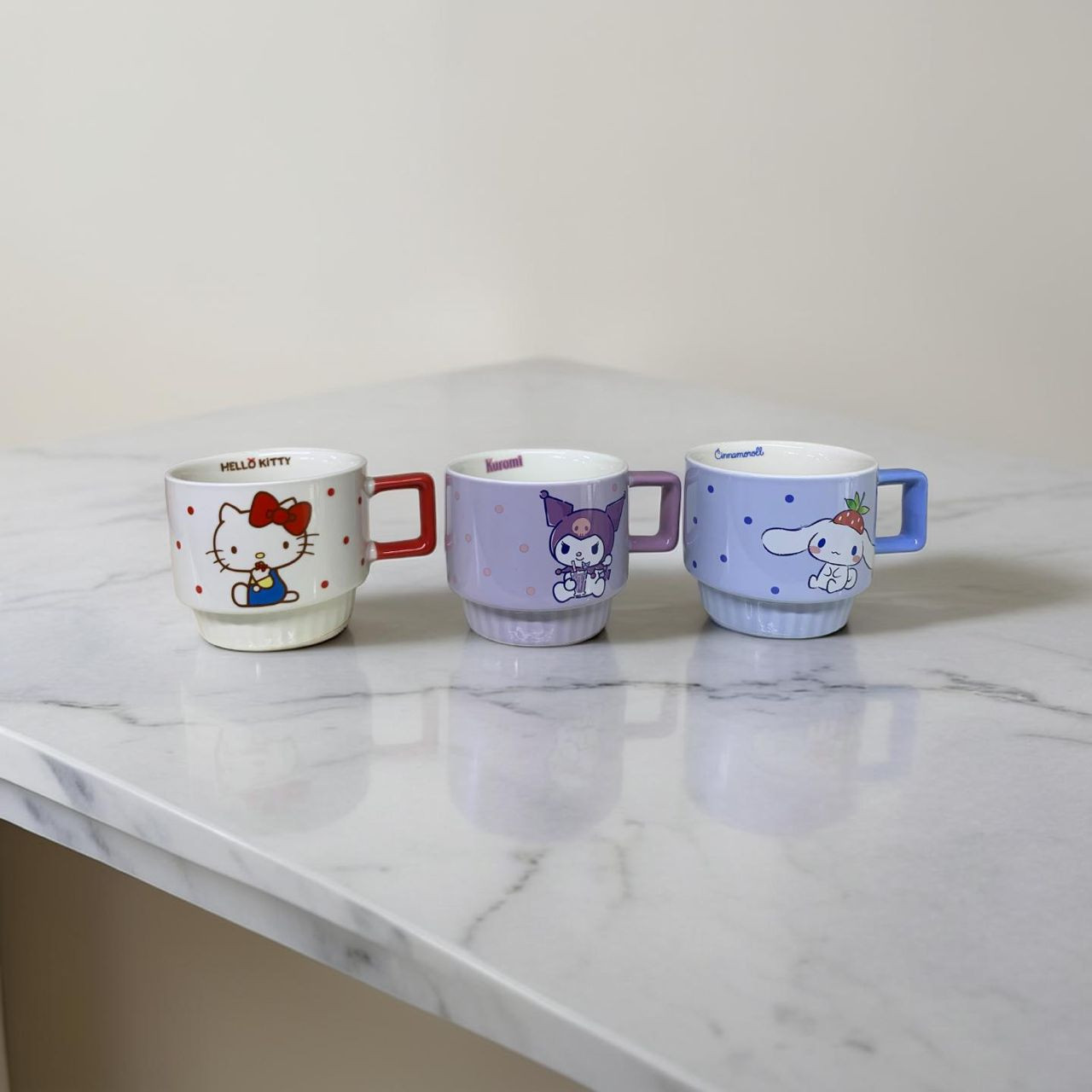 طقم أنيق يتكوّن من 3 أكواب سيراميك مزخرفة بشخصيات سانريو الشهيرة: Hello Kitty، Kuromi، وCinnamoroll. يتميّز كل كوب بتصميم لطيف وألوان هادئة مع مقبض مريح، مما يجعله مثاليًا لتقديم القهوة أو الشاي أو المشروبات الساخنة والباردة.