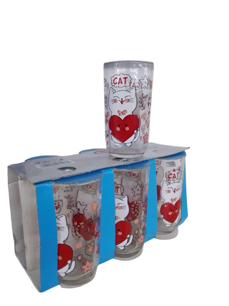 طقم أكواب زجاجية أنيقة مزينة برسومات قط لطيف يحمل قلبًا أحمر، بتصميم جذاب ومناسب للاستخدام اليومي. مصنوع من زجاج شفاف عالي الجودة، ومناسب لتقديم العصائر، الماء، المشروبات الباردة والساخنة. يأتي في عبوة عملية تحتوي على 4 أكواب، مثالي للاستخدام المنزلي أو كهدية جميلة.