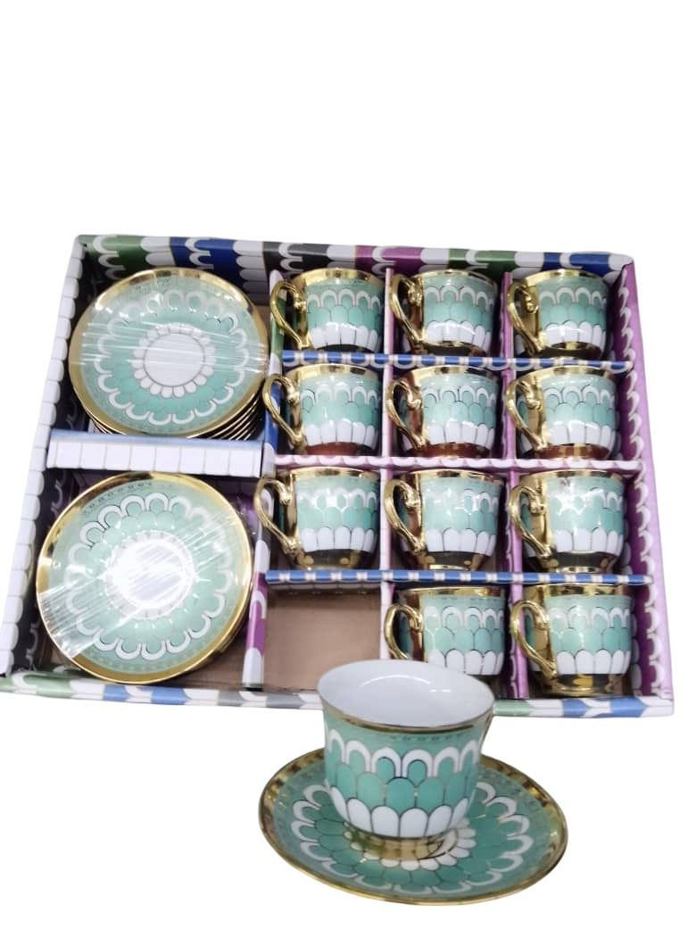 يحتوي الطقم على 12 فنجانًا مع صحون متناسقة، ومعبأ داخل علبة منظمة مناسبة للتخزين أو التقديم كهدية. مصنوع من خامة عالية الجودة تضمن المتانة وسهولة الاستخدام.