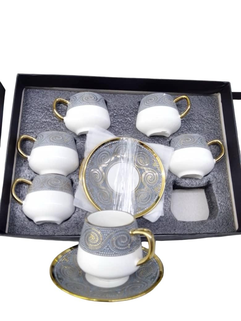 طقم فناجين قهوة مكون من 6 فناجين مع 6 صحن صغير، يتميز بتصميم عصري بألوان رمادية وذهبية على حواف الفناجين والصحون. الفناجين مصنوعة من الخزف الأبيض، وتُضاف لمسة من الفخامة بفضل التفاصيل الذهبية المميزة. يأتي الطقم في علبة أنيقة مع حماية للفناجين، مما يجعله مناسبًا للهدايا أو للاستخدام الشخصي في المناسبات الخاصة.