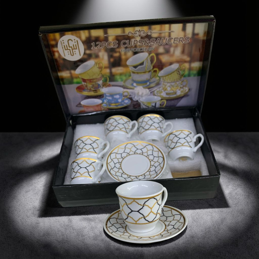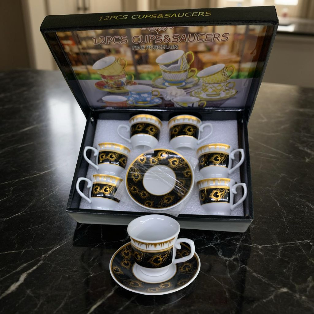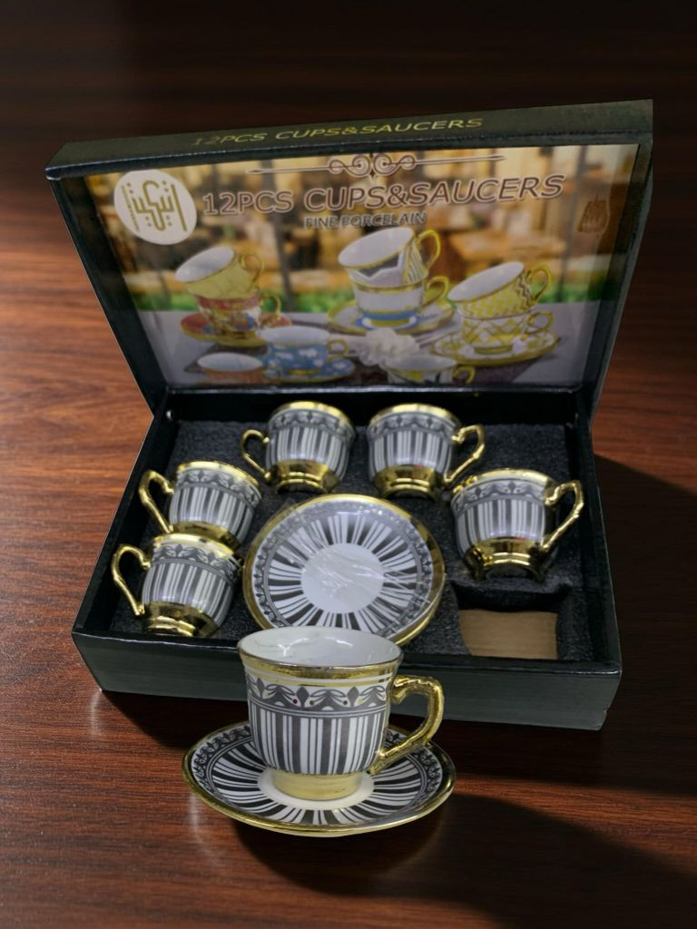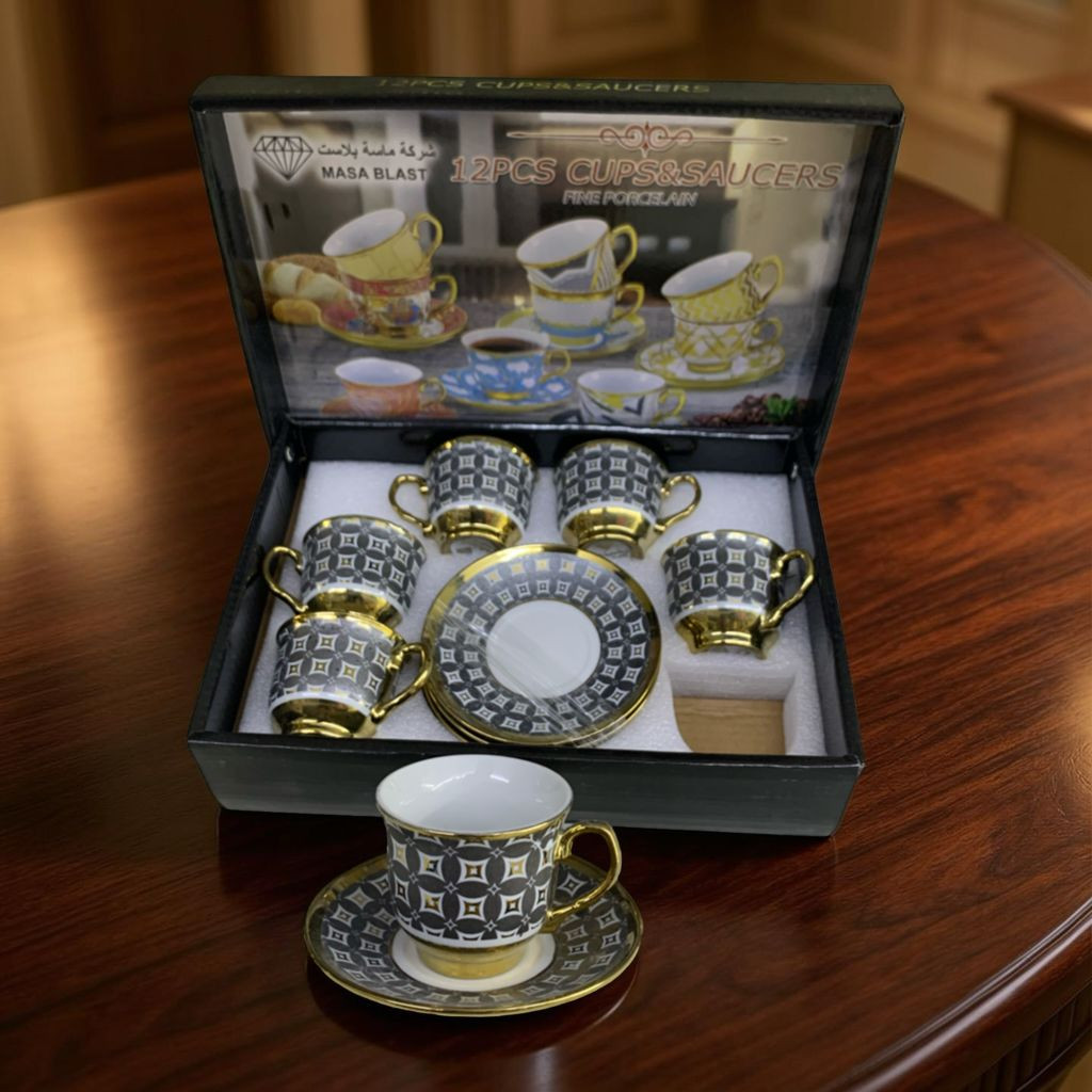طقم أنيق مكوّن من 6 فناجين قهوة و6 صحون، مصنوع من البورسلان عالي الجودة، بتصميم فاخر يجمع بين اللون الأسود والنقوش الذهبية الراقية. يتميز بمظهره الكلاسيكي الجذاب الذي يضفي لمسة فخامة على جلسات القهوة والضيافة.