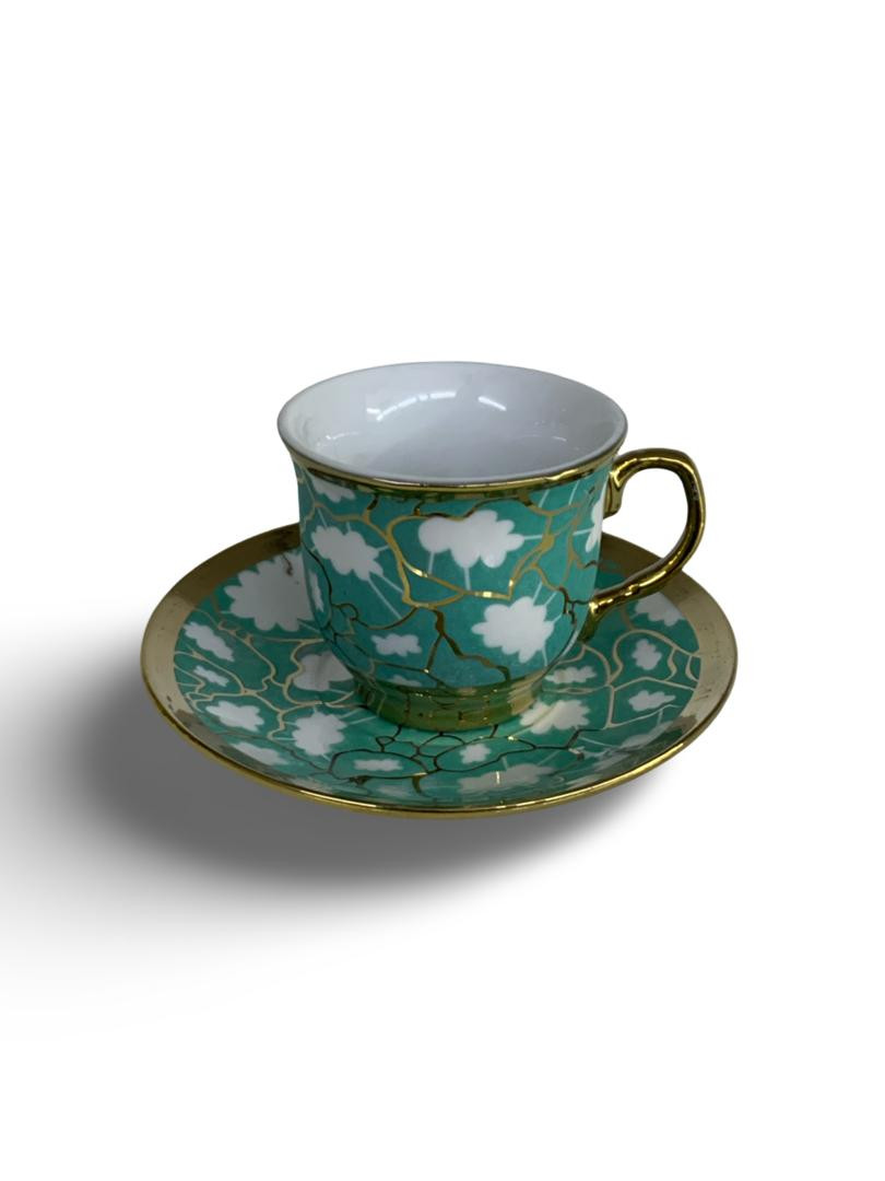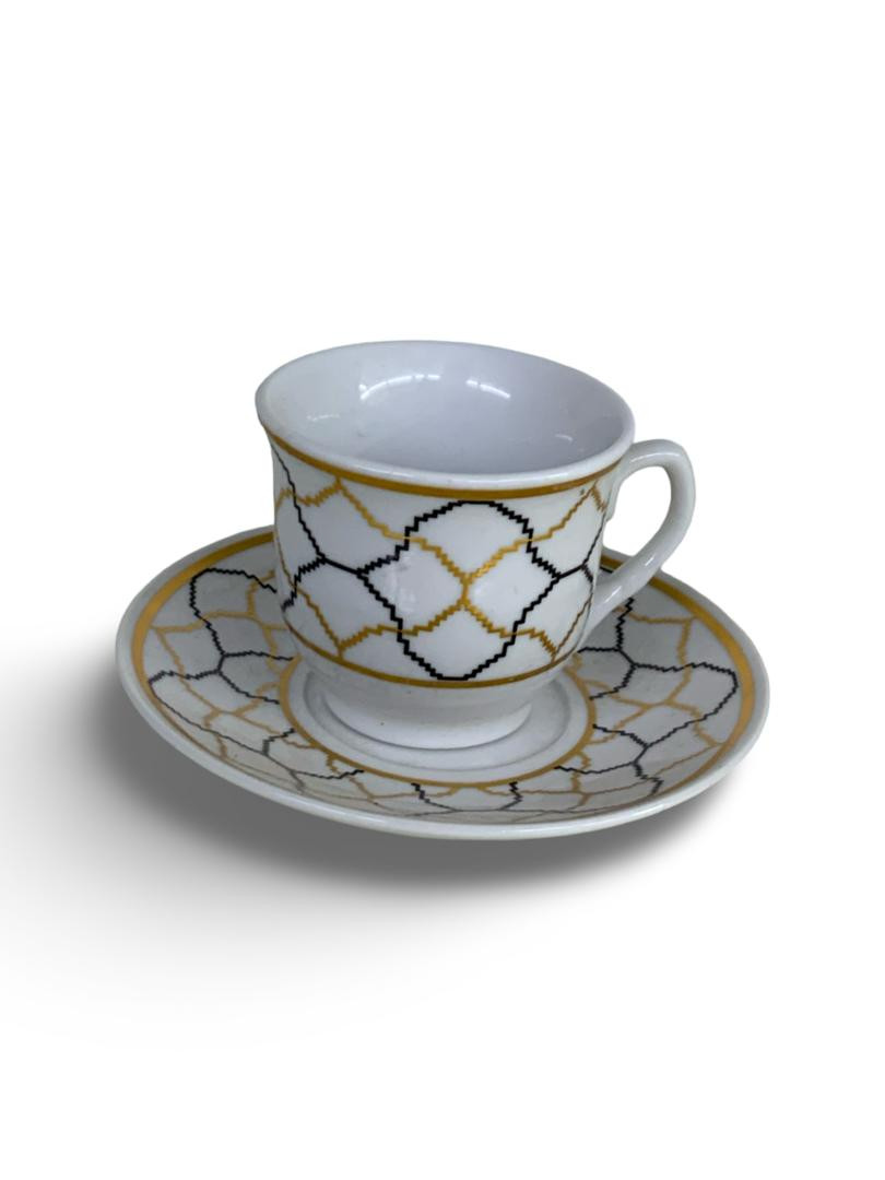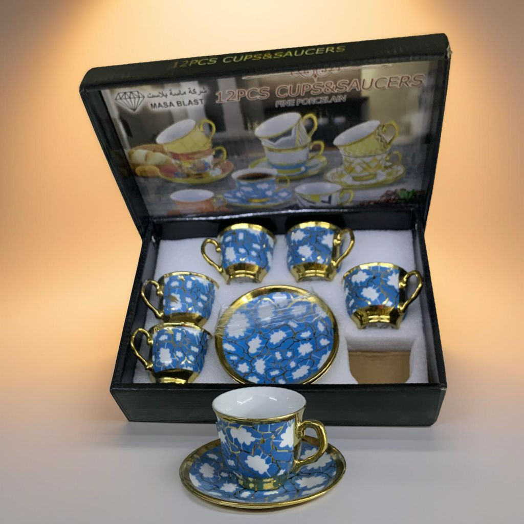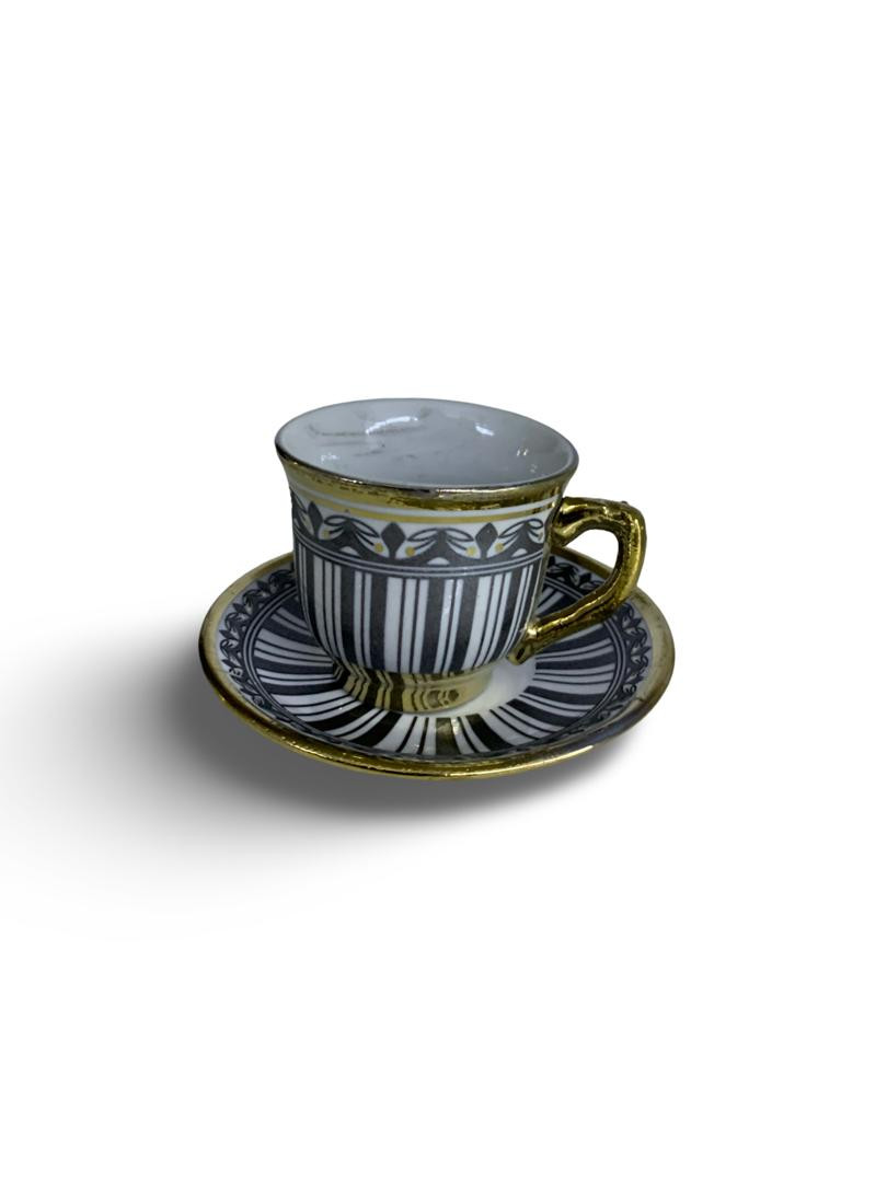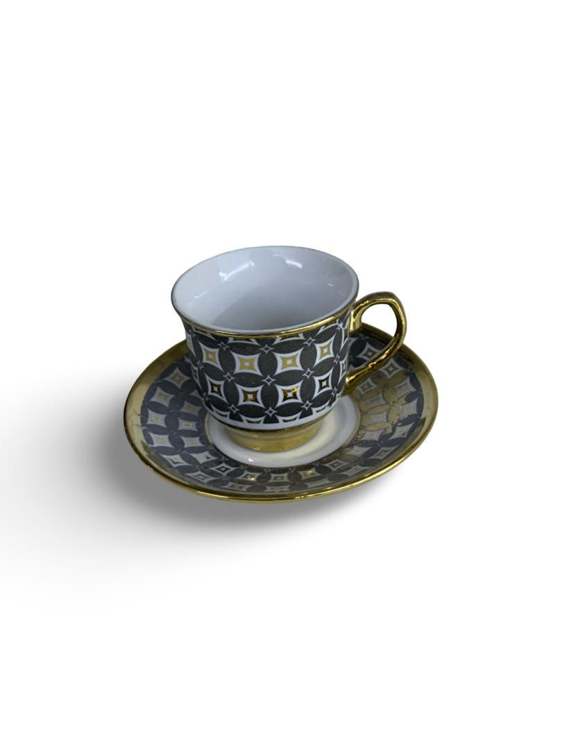 طقم أنيق مكوّن من 6 فناجين قهوة و6 صحون، مصنوع من البورسلان عالي الجودة، بتصميم فاخر يجمع بين اللون الأسود والنقوش الذهبية الراقية. يتميز بمظهره الكلاسيكي الجذاب الذي يضفي لمسة فخامة على جلسات القهوة والضيافة.