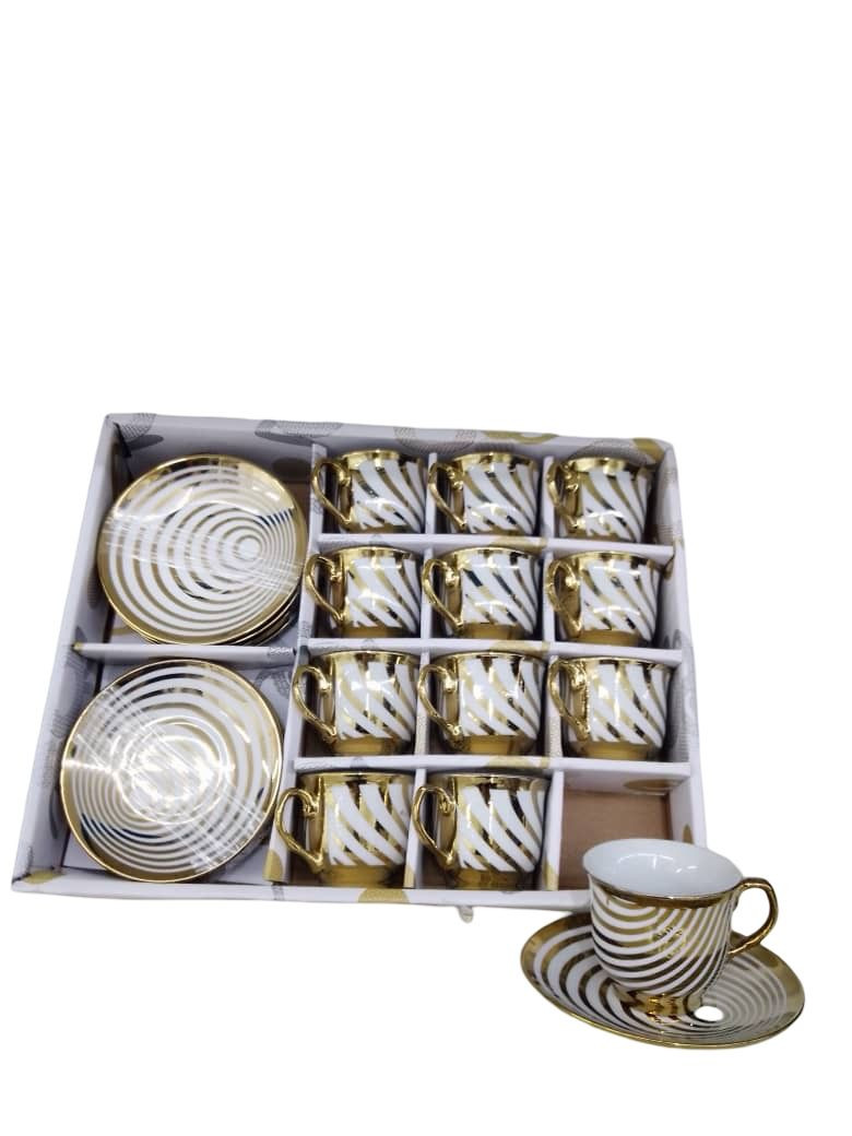اكتشف الفخامة مع طقم فناجين القهوة المزخرف بالذهب، الذي يتميز بتصميمه العصري والأنيق. يتكون الطقم من 6 فناجين مع صحون مزخرفة بخطوط دوامية متقنة باللونين الأبيض والذهبي، مما يضفي لمسة من الفخامة على أي مناسبة. بفضل الجمالية الفريدة، يعد هذا الطقم الخيار المثالي لتحويل لحظات قهوتك إلى تجربة لا تُنسى. مثالي للاستخدام اليومي أو تقديمه كهدية قيمة للمناسبات الخاصة.