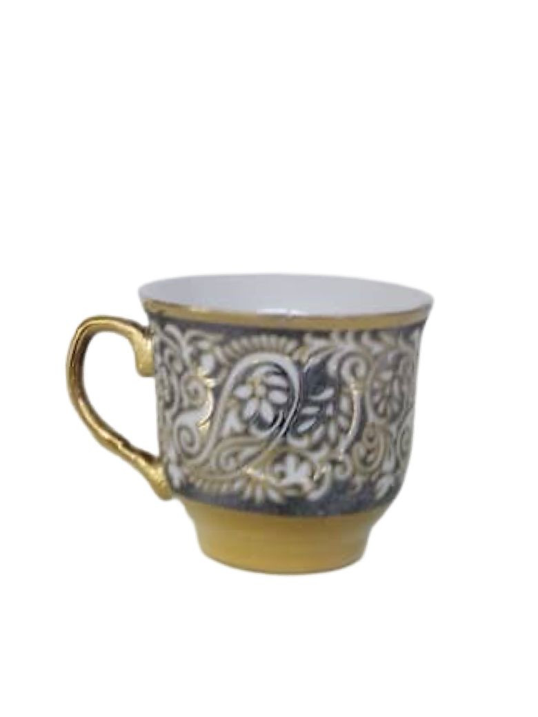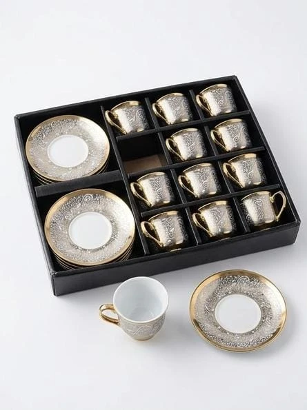 استمتع بتجربة شرب القهوة بطريقة راقية مع طقم الفناجين الفاخر المكون من 12 قطعة، الذي يأتي بتصميم مميز من النقوش الذهبية الرائعة على قاعدة بيضاء لامعة. يضم الطقم 6 فناجين و6 صحون بحواف ذهبية أنيقة، مما يضفي لمسة من الفخامة والجمال على طاولتك.
