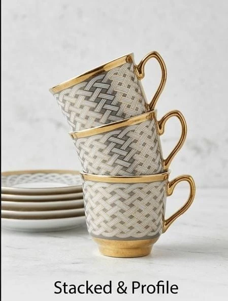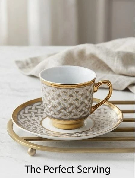استمتع بتجربة شرب القهوة أو الشاي مع هذا الطقم الفاخر الذي يجمع بين الأناقة والعملية. يتكون الطقم من 6 فناجين و6 صحون صغيرة بتصميم فريد من نوعه يدمج بين اللون الأبيض الناصع والزخرفة الذهبية المذهلة. سواء كنت تستضيف ضيوفك أو تستمتع بلحظاتك الخاصة، فإن هذا الطقم سيضيف لمسة من الفخامة إلى طاولتك. مصنوع من الخزف عالي الجودة لضمان المتانة واللمعان الدائم. مثالي للمناسبات الخاصة أو للاستخدام اليومي الفاخر.