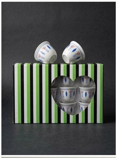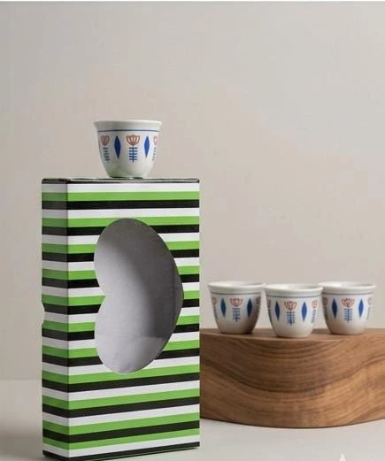 صندوق الطقم مزين بخطوط متناسقة بالألوان الأسود والأخضر، مما يمنحه مظهرًا عصريًا وجذابًا. كما أن الفناجين تأتي بحافة ناعمة، مما يجعلها مريحة أثناء الاستخدام، كما أن الألوان الزاهية للنقوش تضيف لمسة من الحيوية إلى طاولة القهوة.
