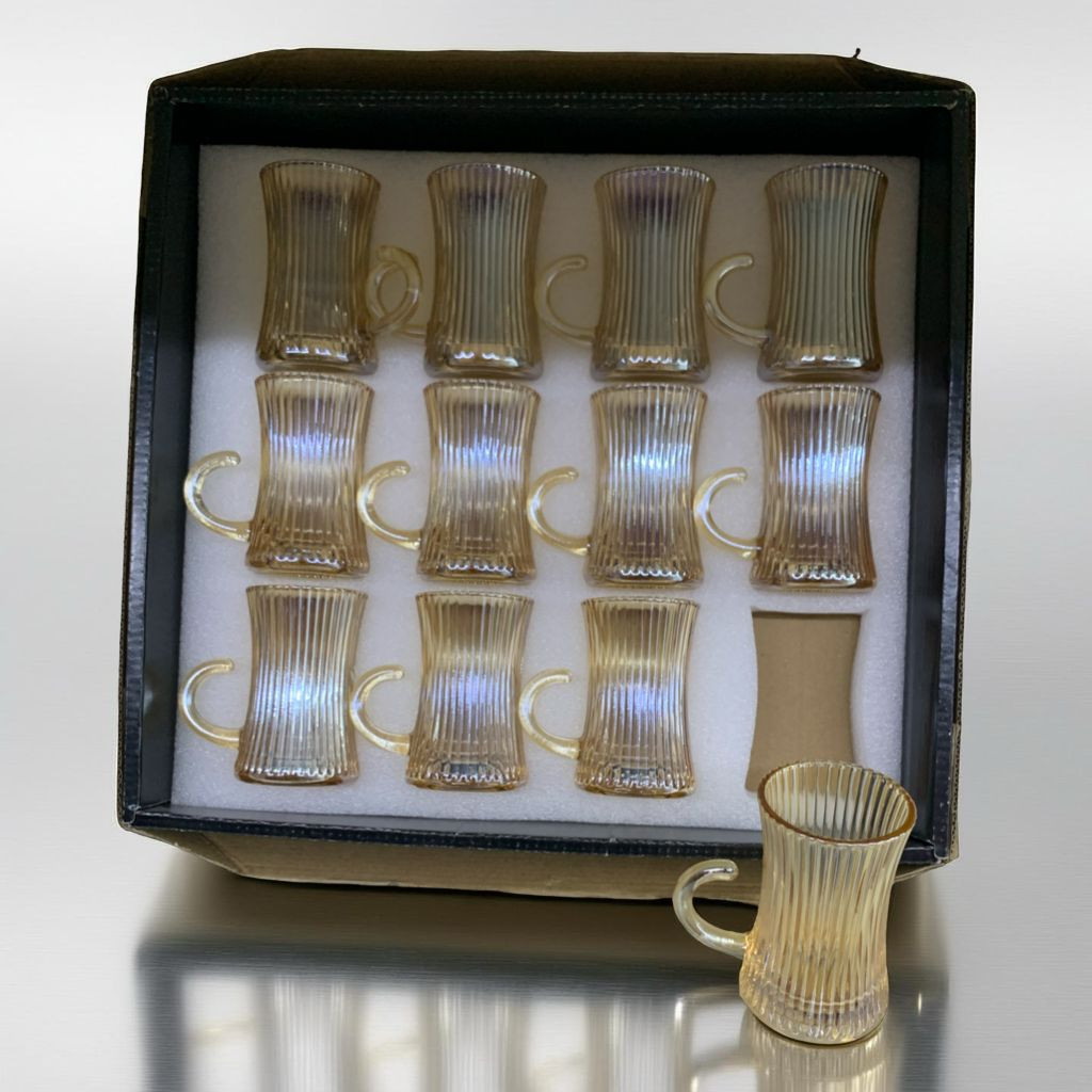 الوصف: طقم أنيق من فناجين الشاي المصنوعة من الزجاج الشفاف بلون كهرماني جذاب، بتصميم مضلّع يمنح مظهراً عصرياً وفاخراً. يتميز كل فنجان بمقبض مريح لسهولة الإمساك، ويأتي الطقم داخل علبة مرتبة للحفظ أو الإهداء. مناسب لتقديم الشاي والقهوة العربية والمشروبات الساخنة والباردة، ويضفي لمسة راقية على طاولة الضيافة.